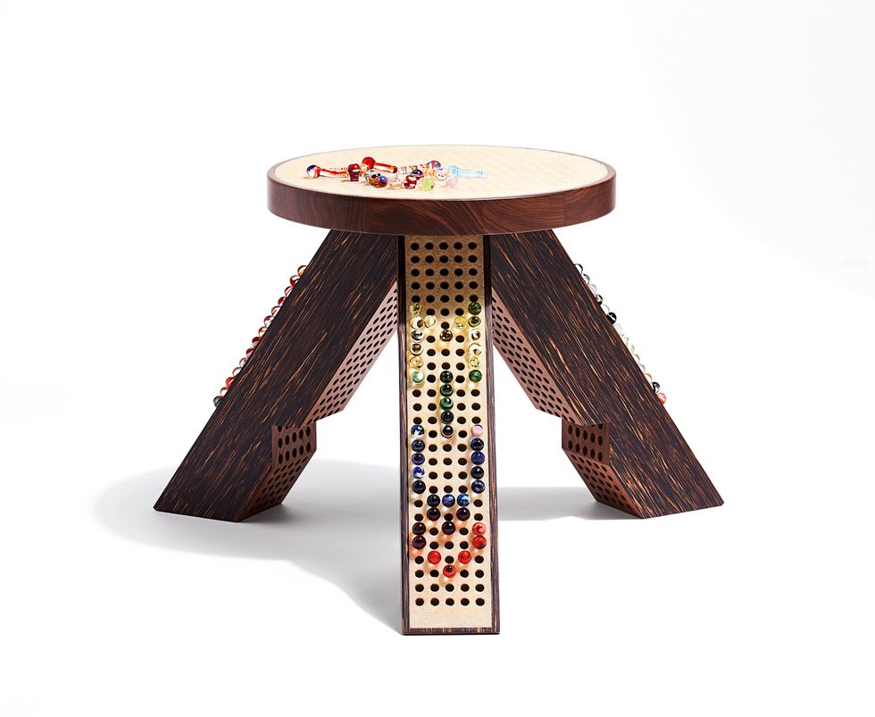 Miu Miu teamed up with Paris design agency M/M to create a limited edition stool for Art Basel, a follow-up of the brand's M/Matching Color Stool launched earlier this year in Mlian. The Miu Miu M/Marbles Stool, which was originally inspired by the label's Fall 2018 runway show set, is crafted with a mix of materials like wood, rubbber, and glass, and features matchsticks inserted throughout that can be moved around and customized.
