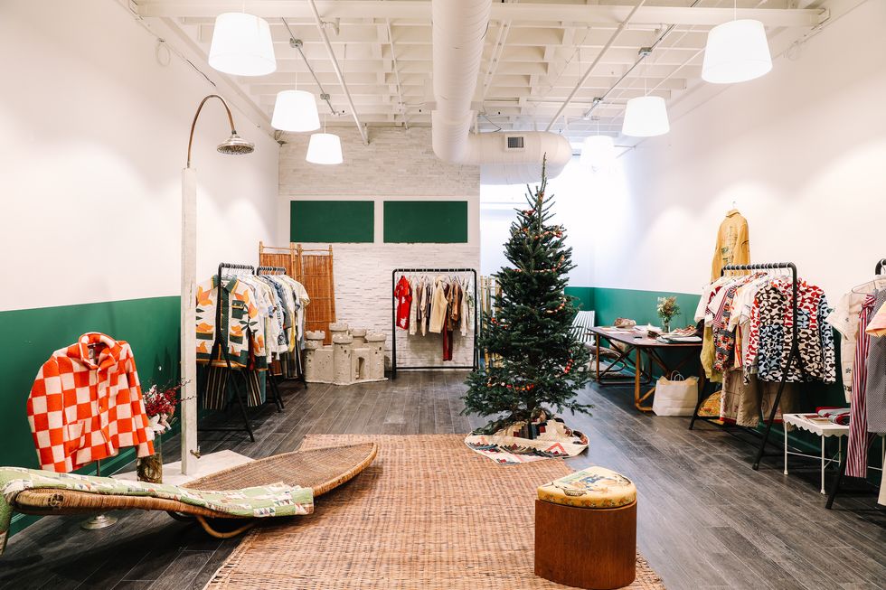 CFDA-winning menswear designer Emily Adams Bode's eponymous label is hosting a pop-up in Miami's Wynwood district over the weekend. She designed the empty space with a Miami deco-period Holiday vibe, featuring select Bode and vintage garments as well as pieces of furniture and design created in partnership with Green River Project LLC. The holiday installation was made possible by Appear Here, the startup that rents out pop-up space to businesses, independent designers and fashion brands alike. The Basel pop-up is part of the "Appear Here presents" series, which transforms empty venues into engaging spaces during key cultural moments.
