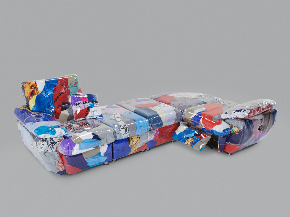 Balenciaga collaborated with artist, architect, and furniture designer Harry Nuriev on a new artwork as an example of environmentally conscious design, giving generations of garments and other materials another life. The oblong sofa is upholstered with damaged or otherwise unsellable garments and off-cuts from obsolete stocks of Balenciaga clothing, encased by scrapped transparent vinyl. Patterns, cuts, and tags within the stuffing are a mix of past seasons and ideas.