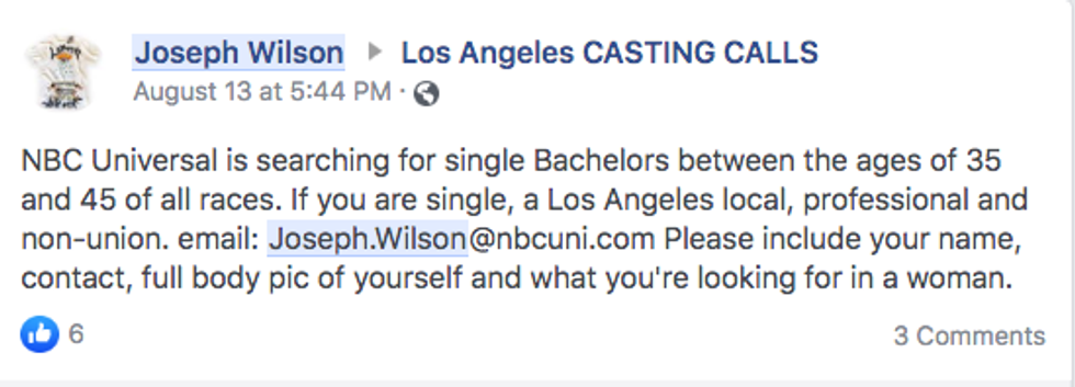 We gathered (or, more accurately, read into) this from a typo-ridden Facebook post on the Los Angeles CASTING CALLS page (among other casting groups) for "single Bachelors Artist between the ages of 35 and 45, above 5'7" and any race." To fit the mold, you also need to be an LA local, "involved in the arts community at some capacity" (which seems dangerously vague) and non-union, so they can pay you pennies for your televised humiliation.