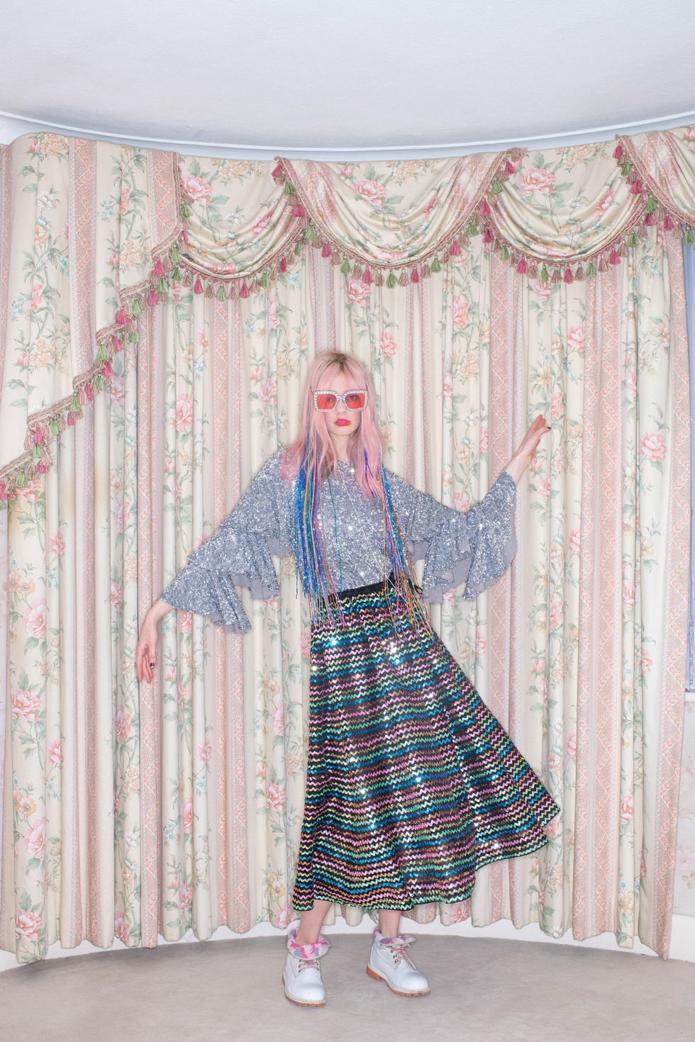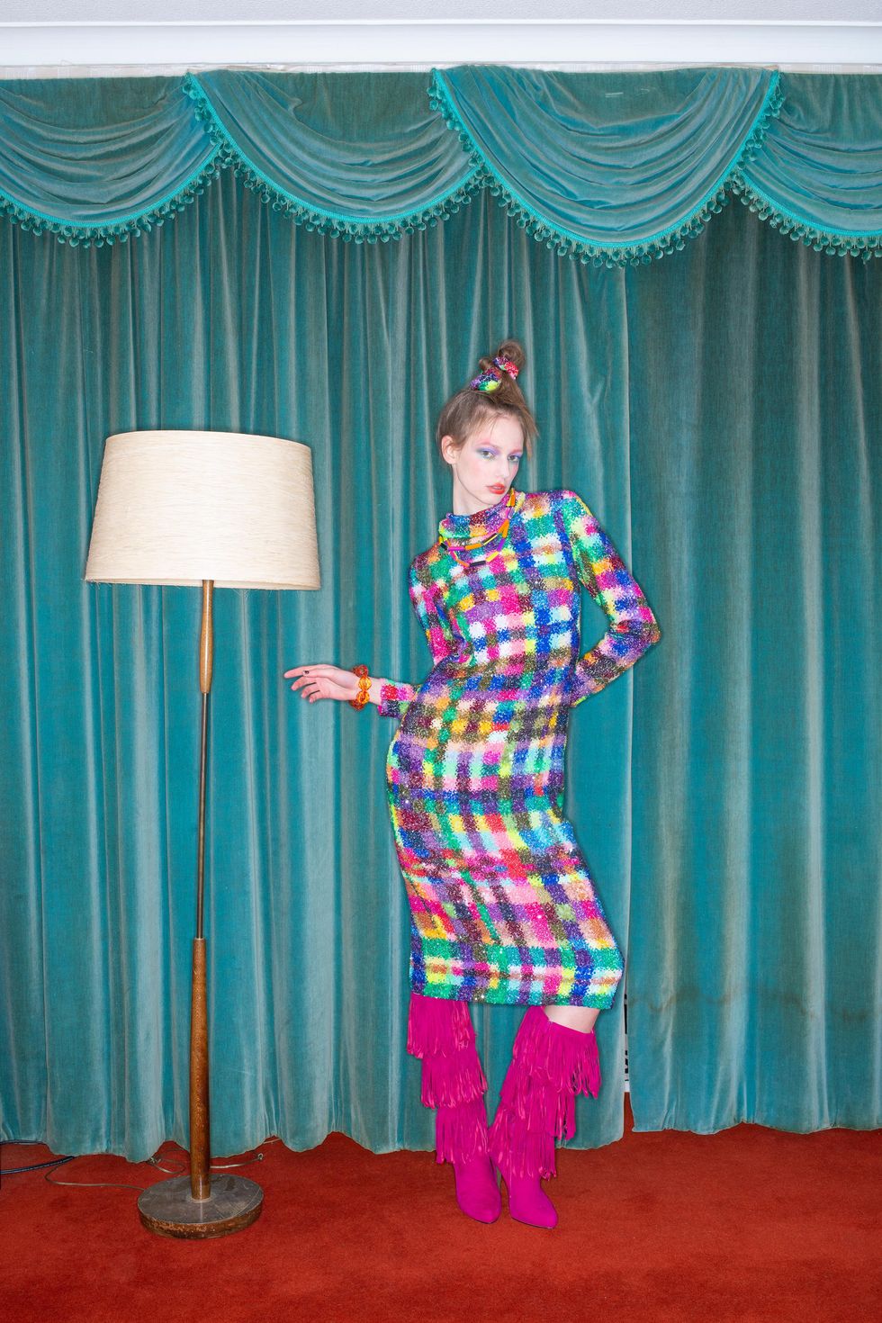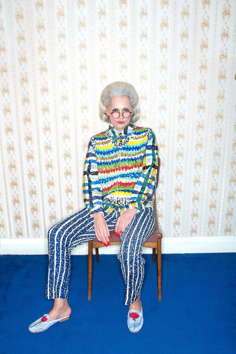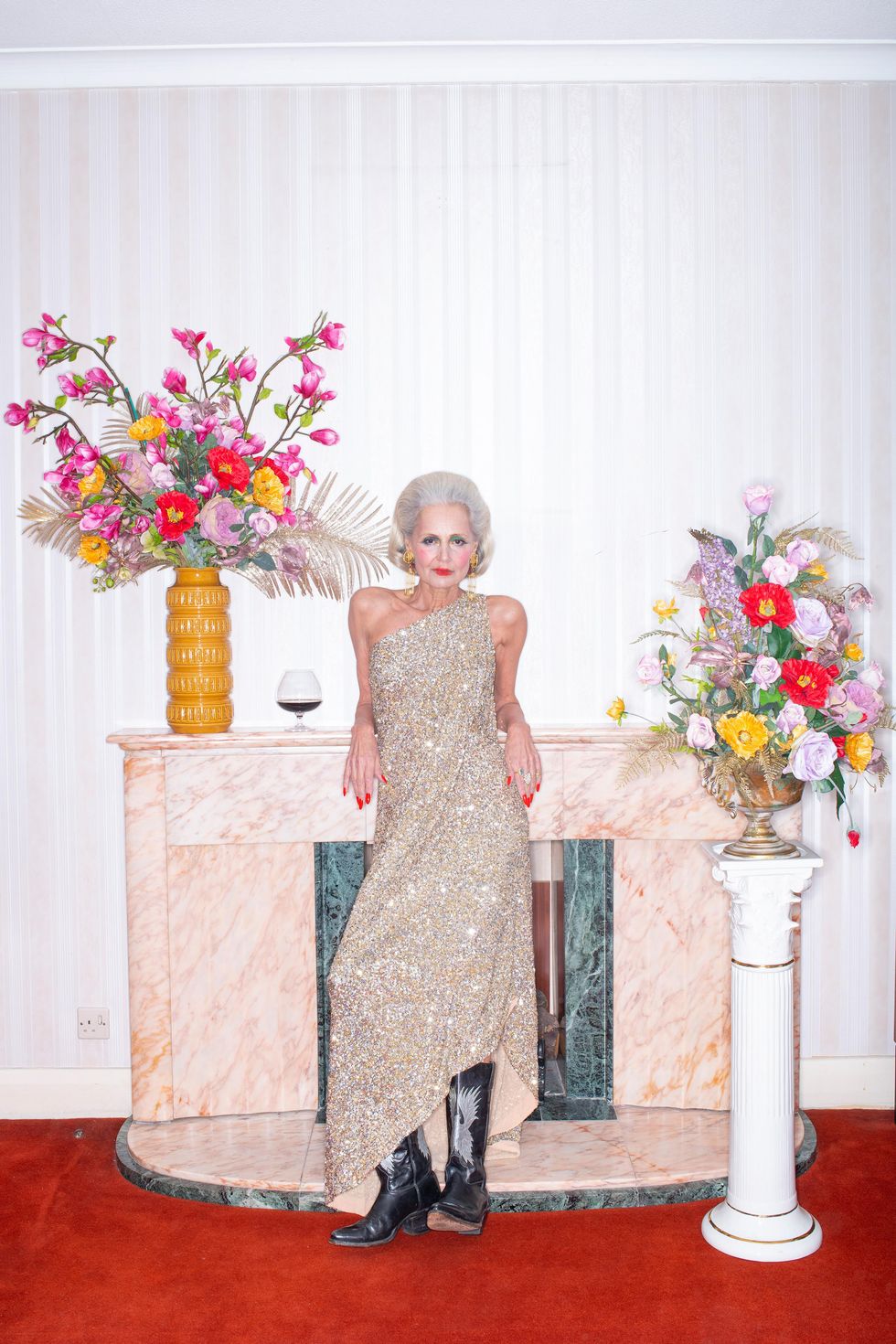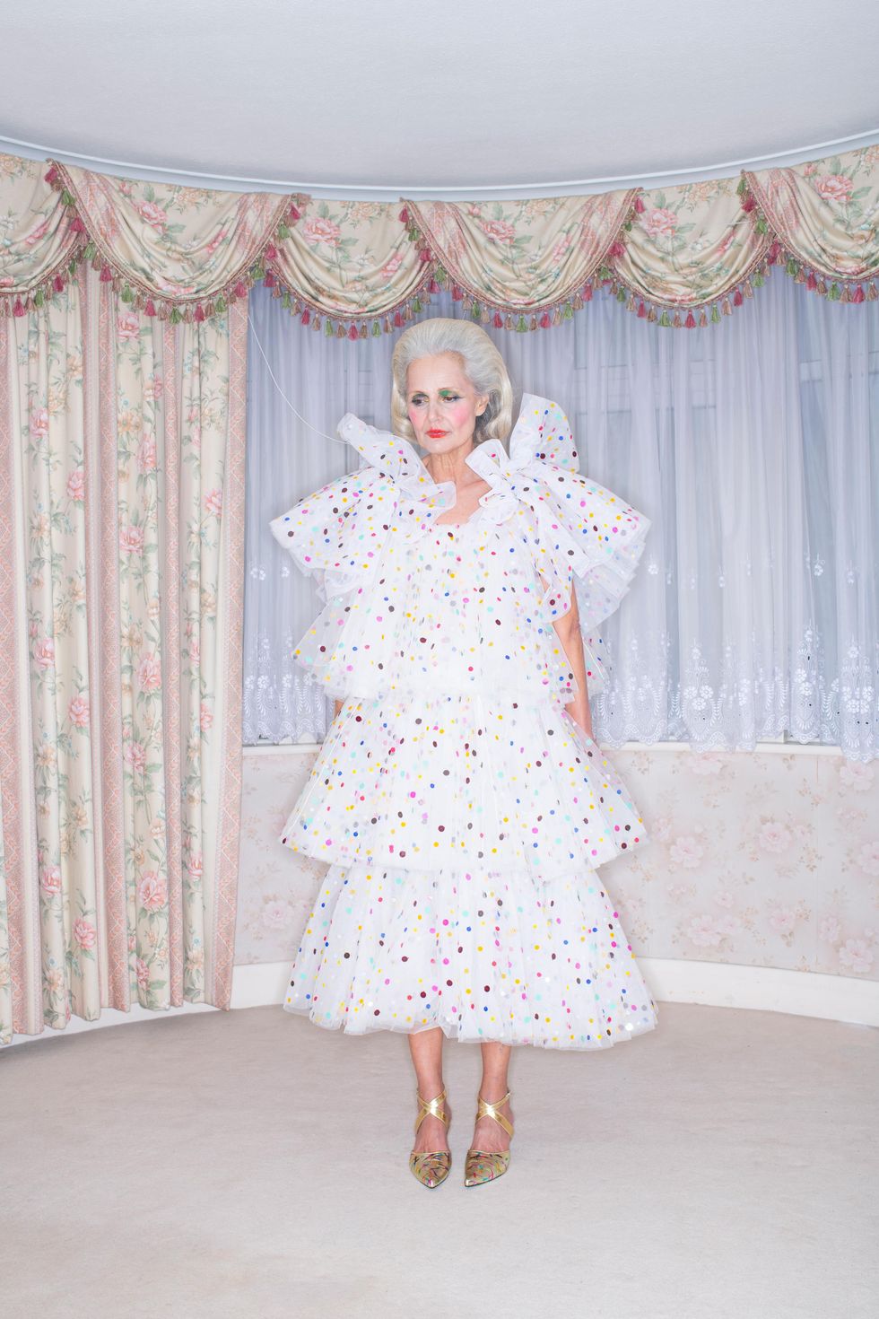 For the lookbook, Gupta rented an abandoned 1930s house in North London with models — one of which is a fabulous older woman with perfectly coiffed white hair — wearing the collection's maximalist party frocks indoors. The concept of wearing glamorous clothes at home with nowhere to go resonated with the designer, so he had the models doing everyday indoor activities to capture the eerie times we live in.