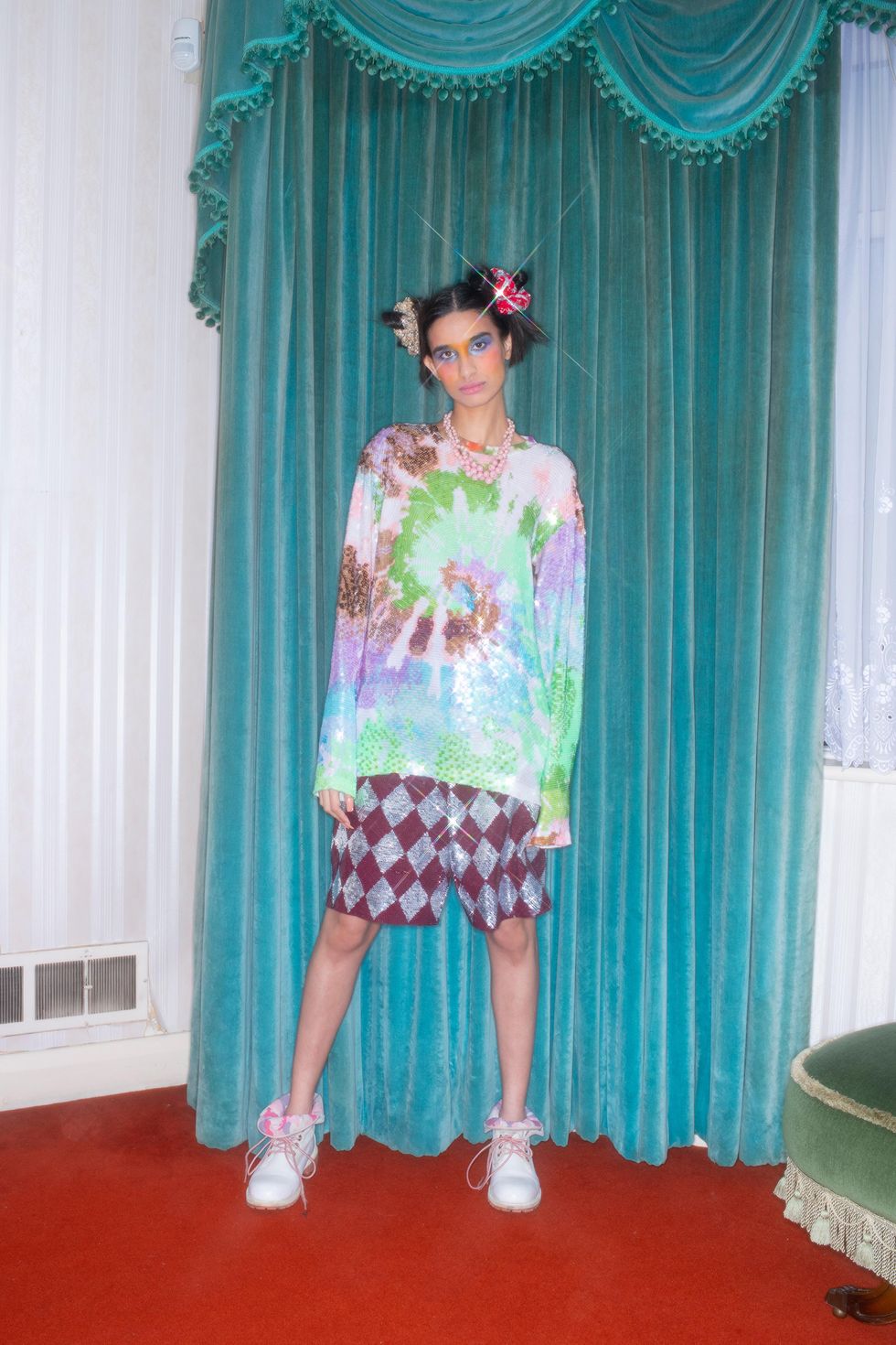 In letting go of his control freak nature, Gupta was able to treat this collection as a form of art therapy, where rainbow elements of drawings and paintings were translated into sequin and beaded fabrics. For example, a pair of tie-dye jeans was actually a pair of old overalls he had lying around in the studio which he splattered with paint before rendering the paint in brightly colored sequins.