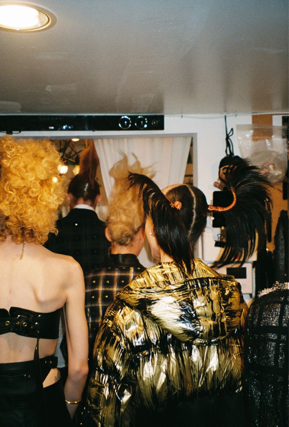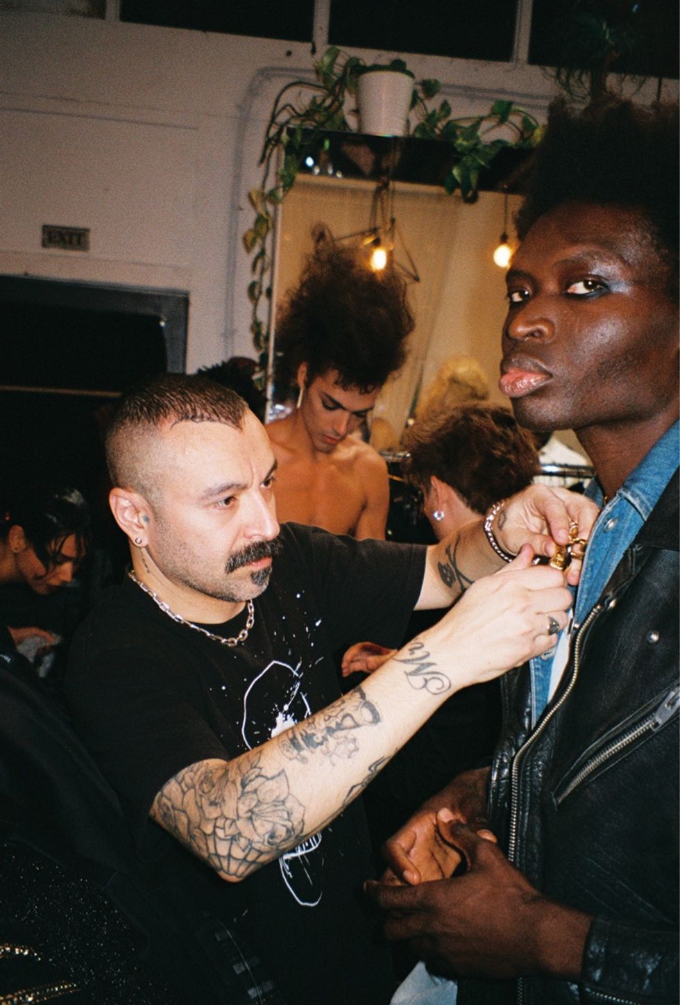 Models walked the runway in exaggerated 3-D printed safety pins and studs made of 24k gold and silver, hand painted bombers, frayed denim, distressed knits, and Mongolian fur and pony hair miniskirts. "We elevated things that are typically more grungy and made it luxury," he says. "I love the idea of highlighting things that are viewed as a 'failure' and making it into something incredible."