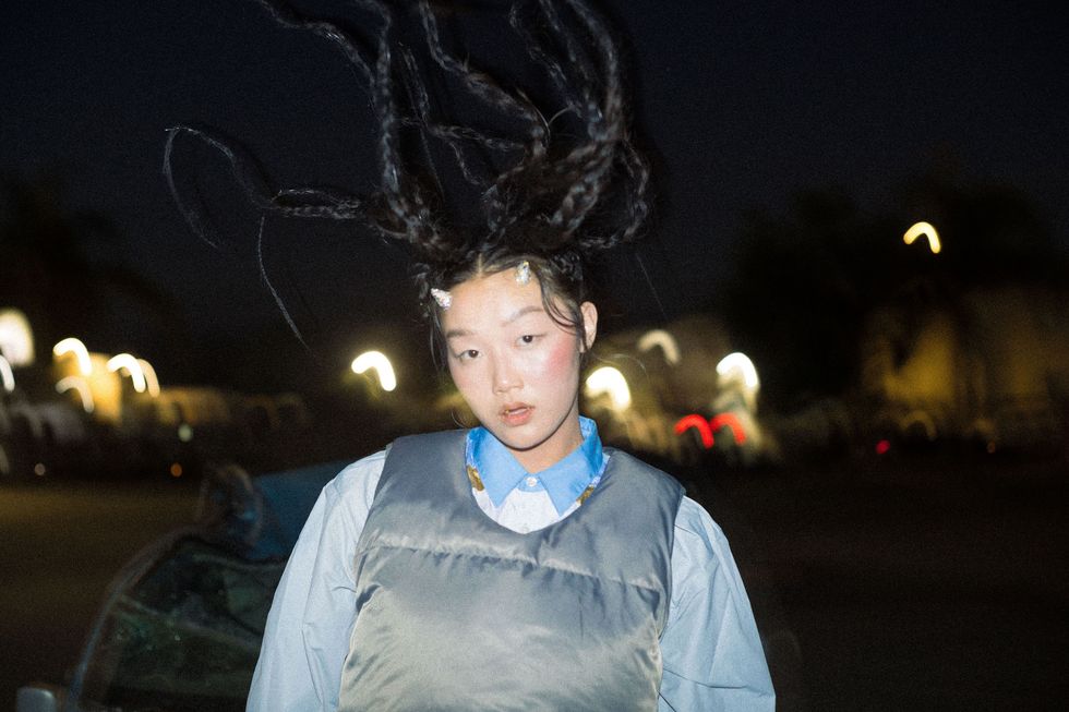 She fixates on the idea of flying through her self-proclaimed “sonic paintings.” In her dream-like new video for “Cellulite,” Nuna falls head-first from the top of a skyscraper, winking at the camera and making the free-fall look effortlessly cool, before crashing onto the top of a car. “Locket” also incorporates this kinetic energy, with art-goers being sucked into the singer’s locket necklace. “Flying is a feeling that I always chase,” she says.