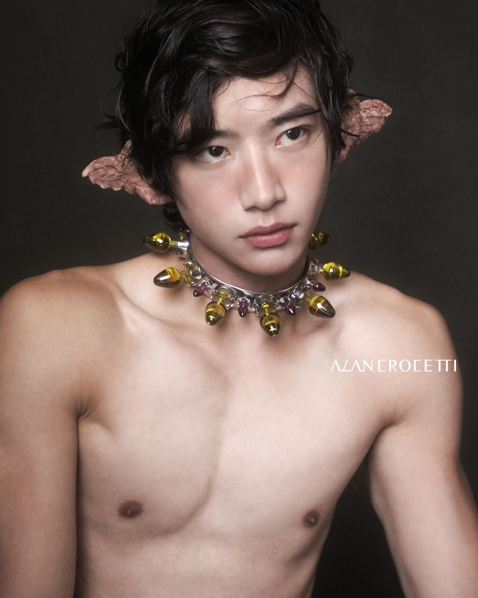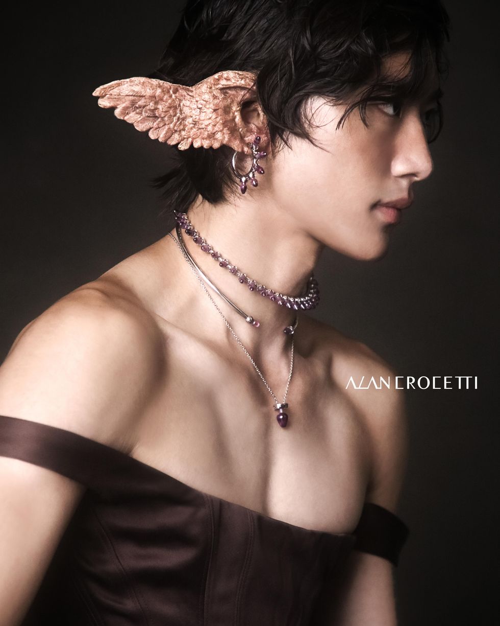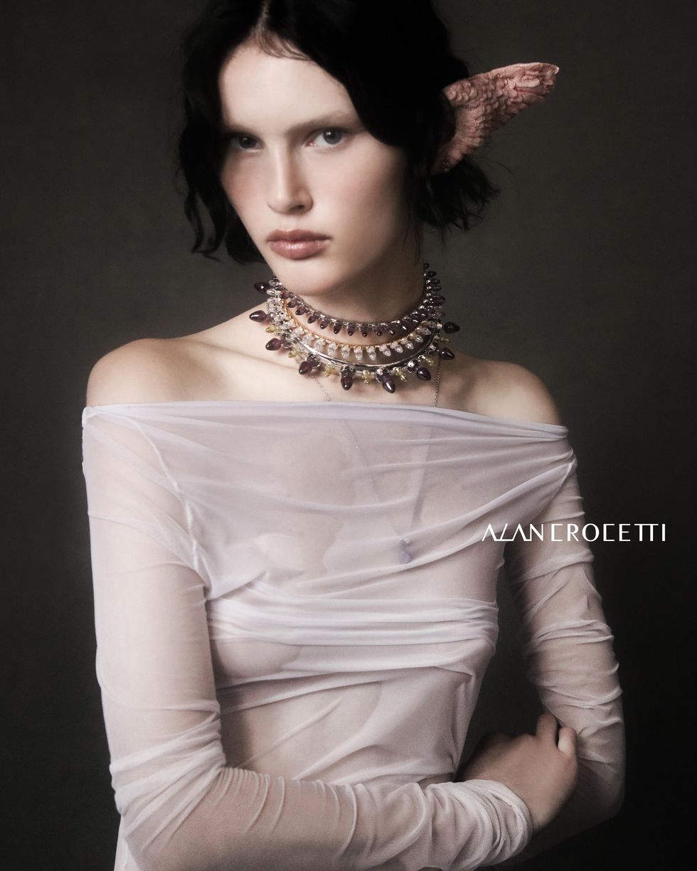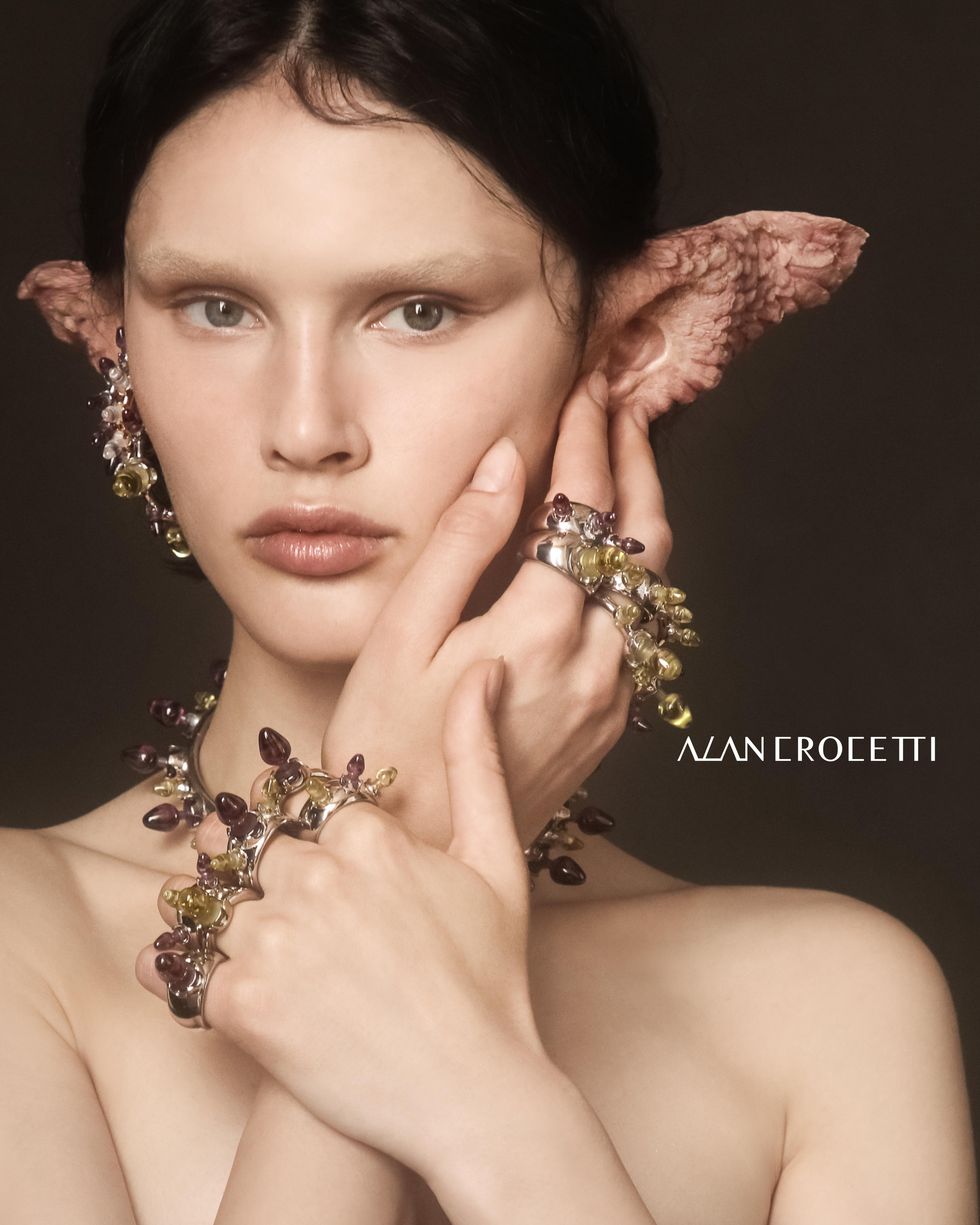 Jewelry designer Alan Crocetti's new collection, called "Deep Fantasy," focuses on the Love Struck Dolphin, a motif seen in necklaces and earrings, followed by some punk-inspired fantasy butt plug crystal rings in lavender and peridot. The campaign was shot by Szilveszter Makó and features models wearing prosthetic elf ears.