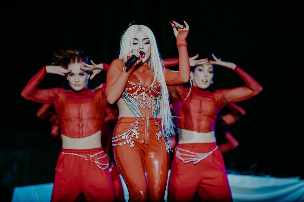 The red outfit she wore for her second stop in Hershey, PA — a sheer bodysuit and leather pants hybrid embellished with metal chains and cross pendants. "I am huge fan of The Blonds and have worn a few of their designs during my performances over the last year," she tells PAPER. "It was a dream to collaborate with them on custom outfits for my tour. I couldn't be happier with how the pieces turned out!"