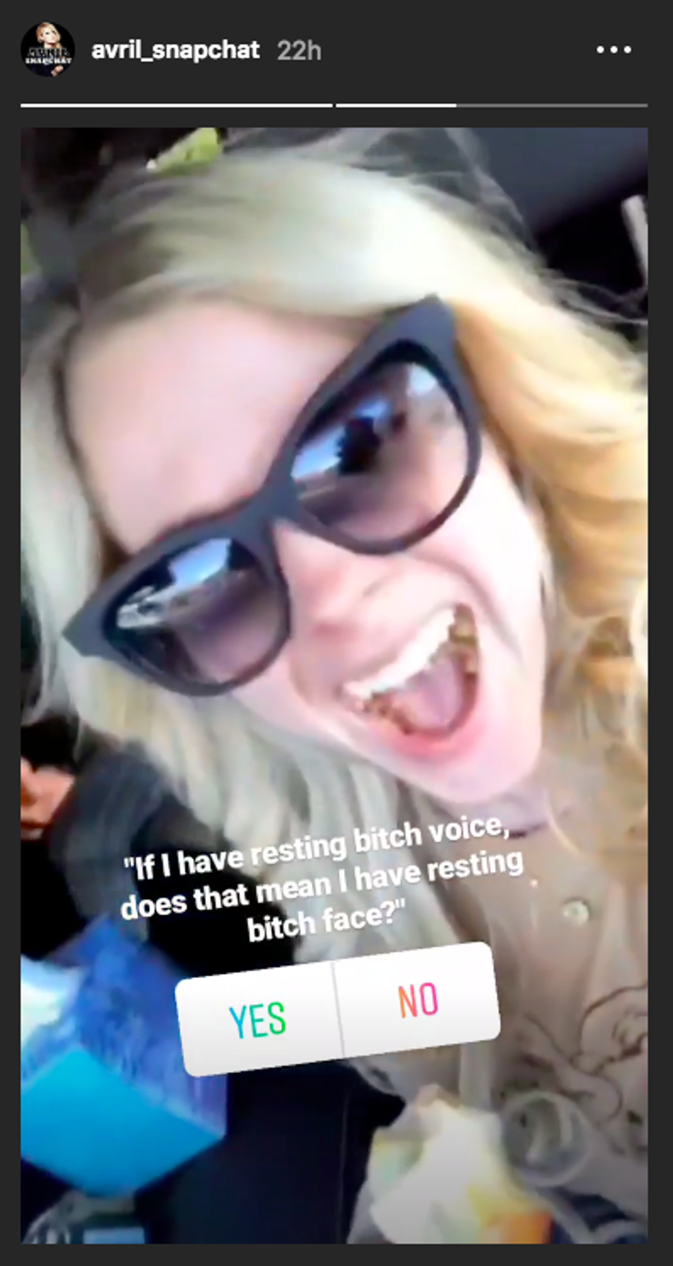 In an Instagram story, live Friday afternoon, Avril laughs with a friend in the car: "If I have resting bitch voice, does that mean I have resting bitch face?"