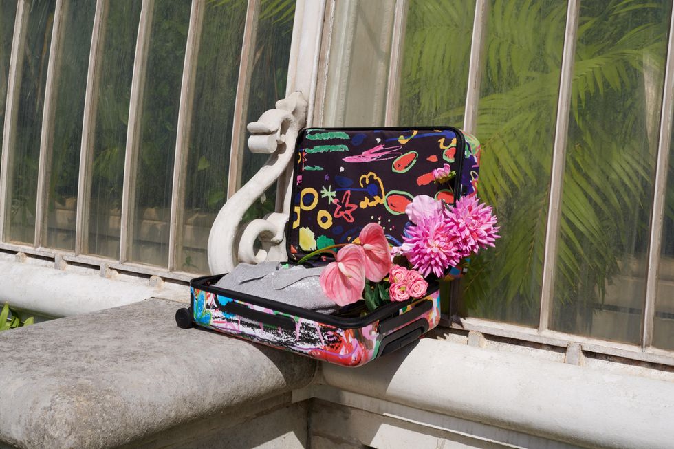 The bold Ashish styles feature crayon-inspired graphics and florals. “I love when people customize their suitcases so they no longer look pristine," Ashish Gupta says. "I really like a good scribble and I wanted to bring that unrestricted creative mentality into my collection."