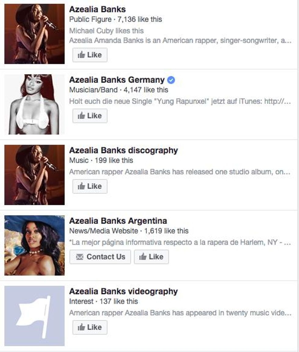 The only ones remaining include verified "Azealia Banks Germany" page, and an unofficial profile--both mostly inactive and fan-run.