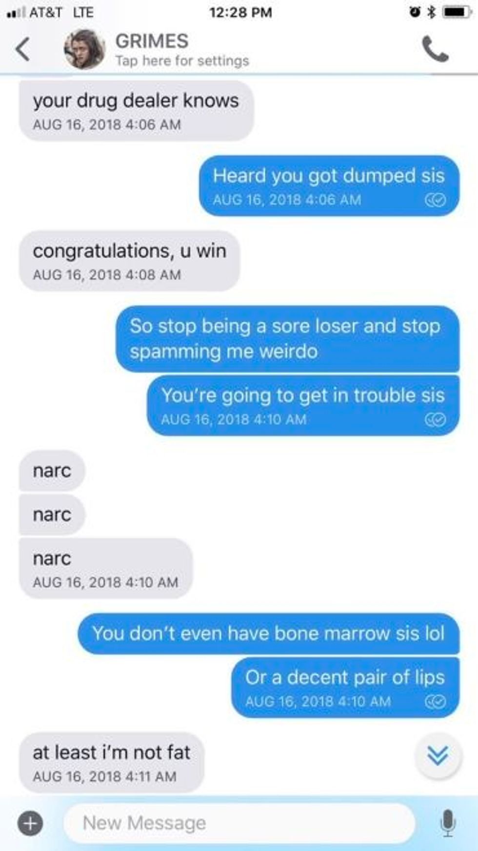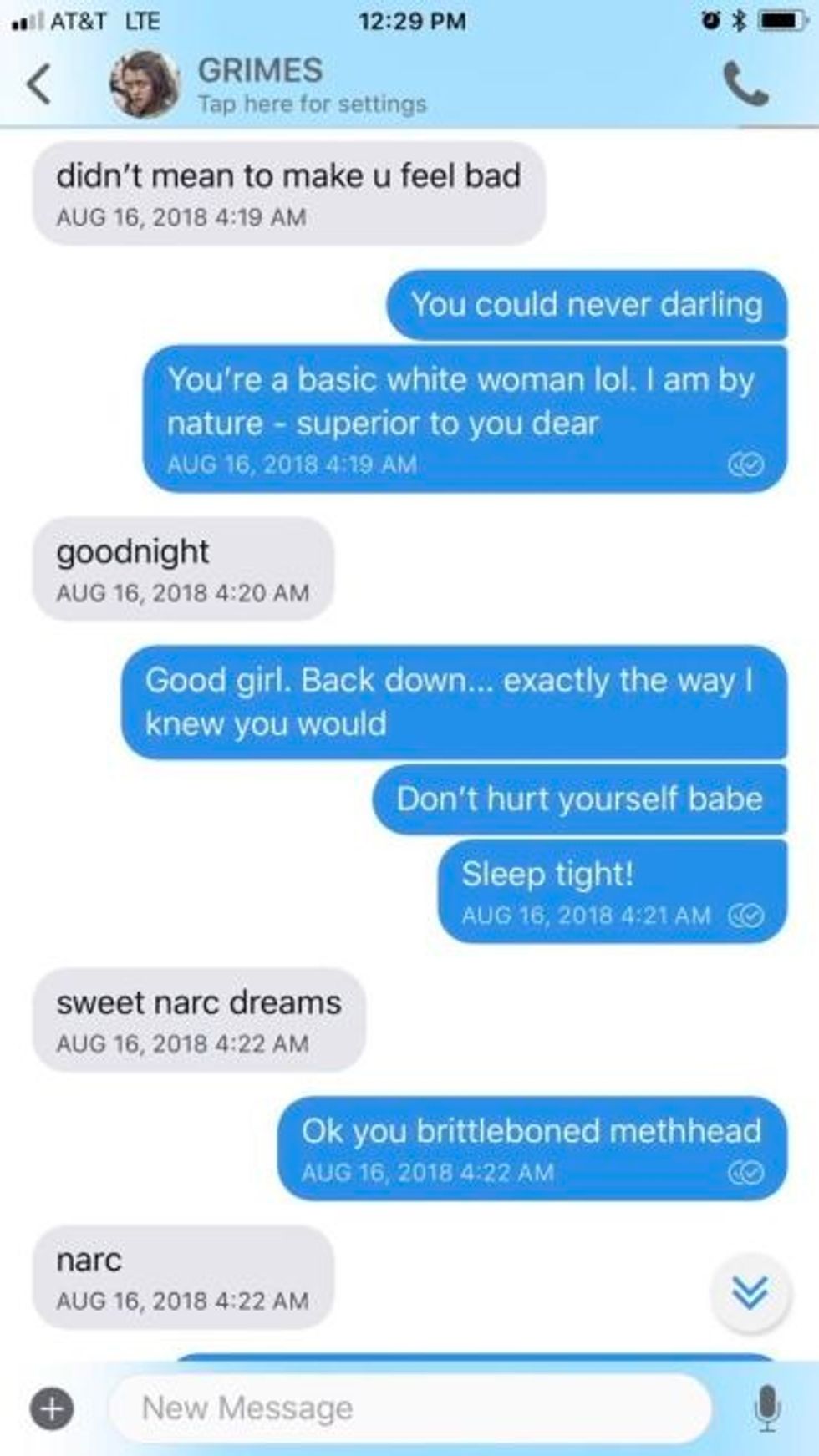 Wow! Cutting deep. Might be going out on a limb here, but this attack feels two-pronged, suggesting that Grimes, sans bone marrow, is both weak and crush-able, and an artistically soulless android/lab-experiment.
