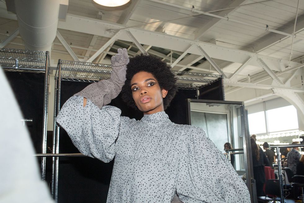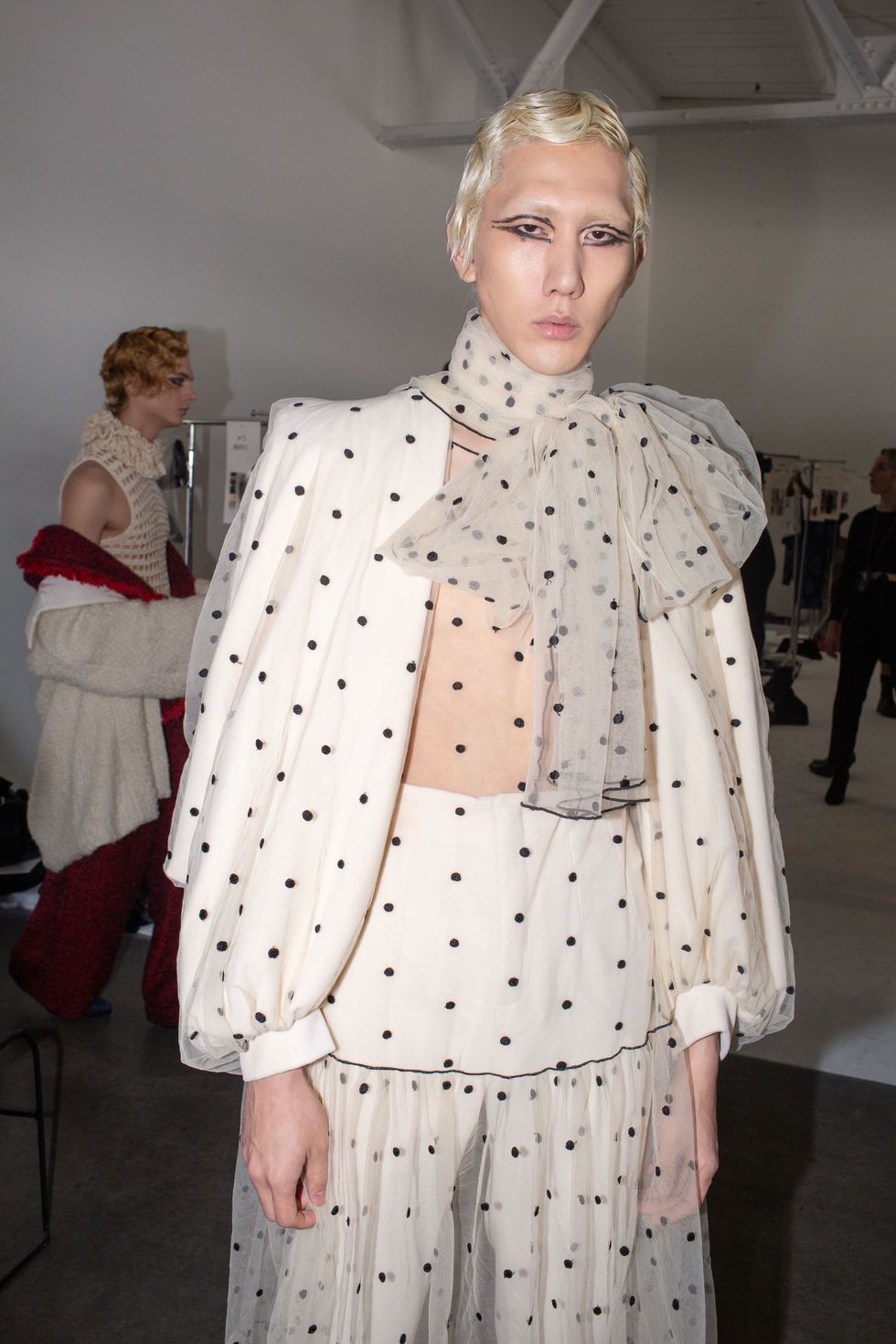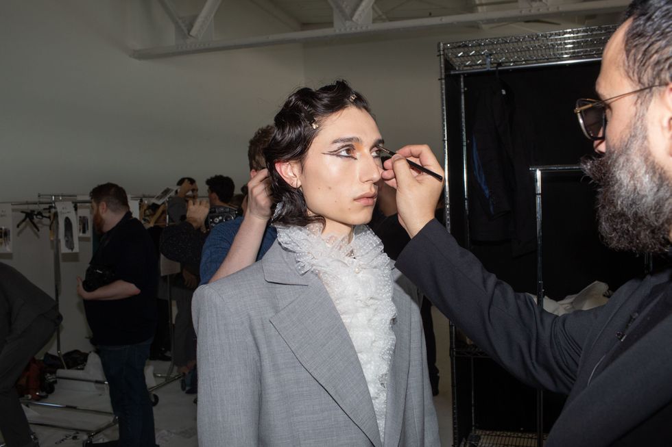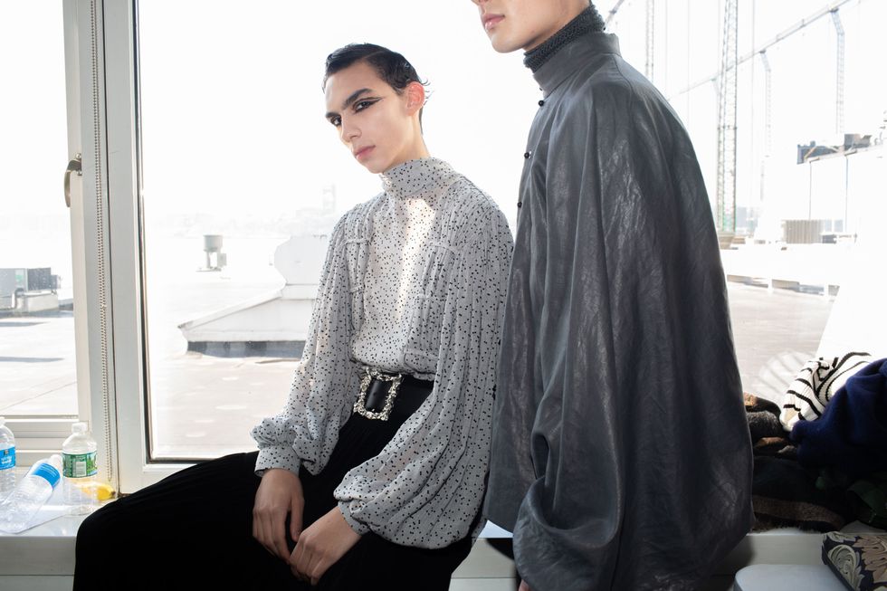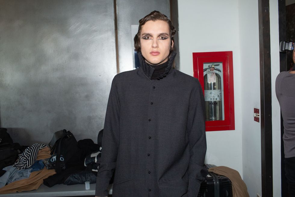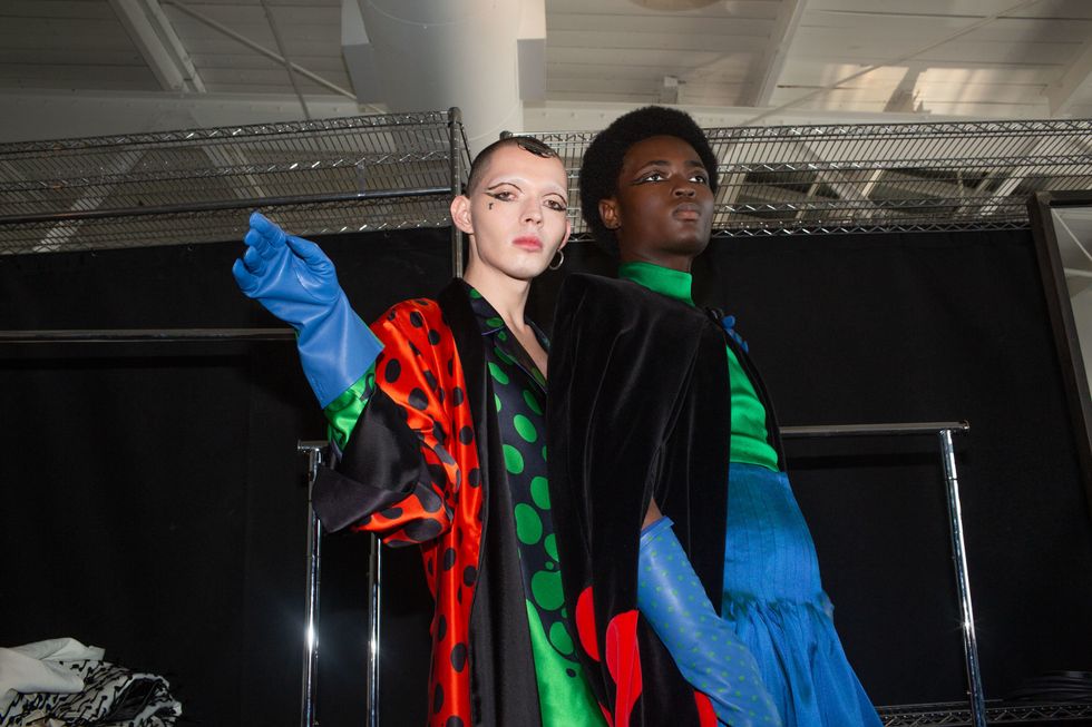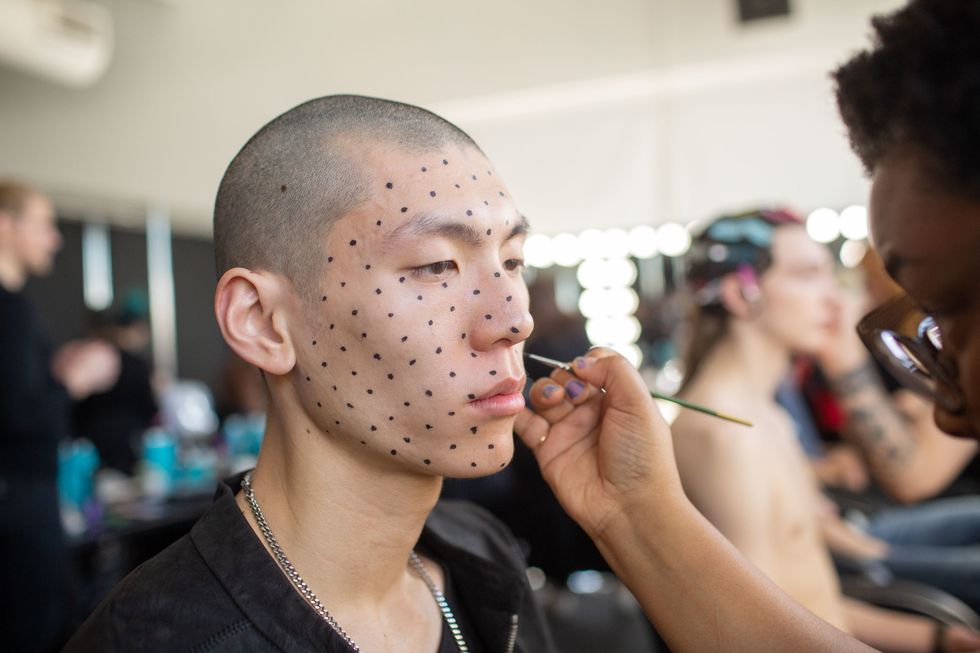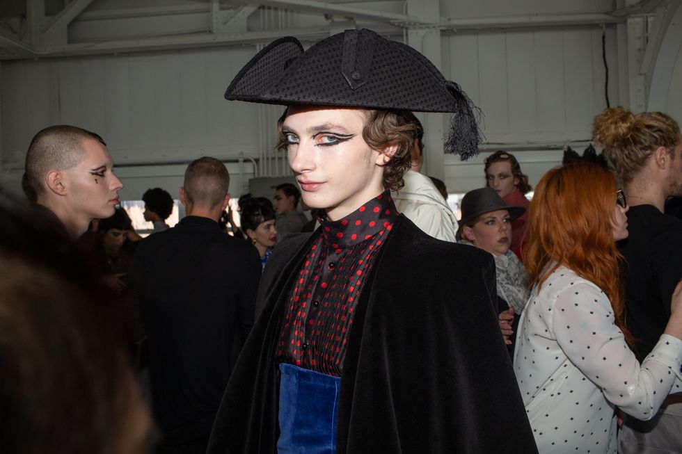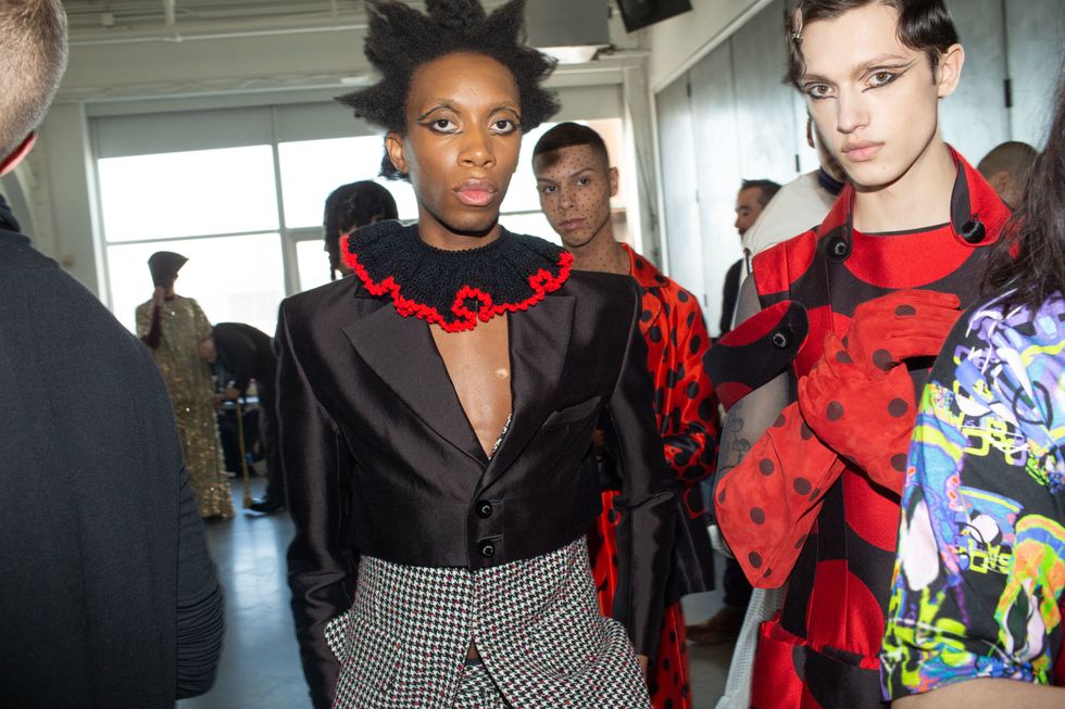 Backstage at Palomo Spain, designer Alejandro Gómez Palomo was putting the final touches on the models for his fall 2019 show. MAC makeup artists applied tiny polka dots all over models' faces in addition to dramatic, mod-inspired cat eyes. The label's eighth collection included Richie Shazam and other cool kids and unconventional models wearing ruffled collars, opera gloves and oversized polka dot pieces. As for the inspiration, Palomo called the collection "1916," and took cues from the historical period when the Ballets Russes came to Spain.