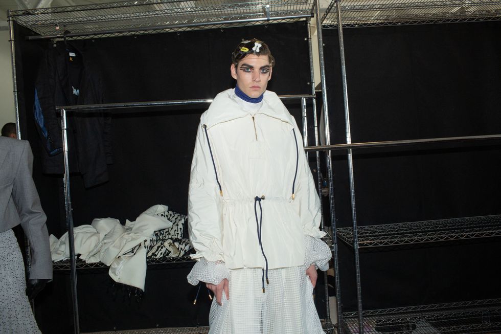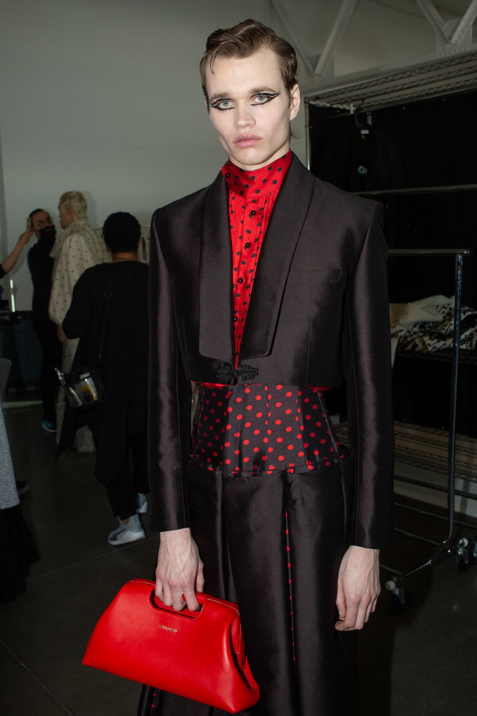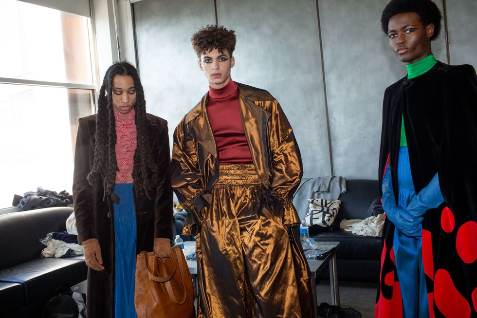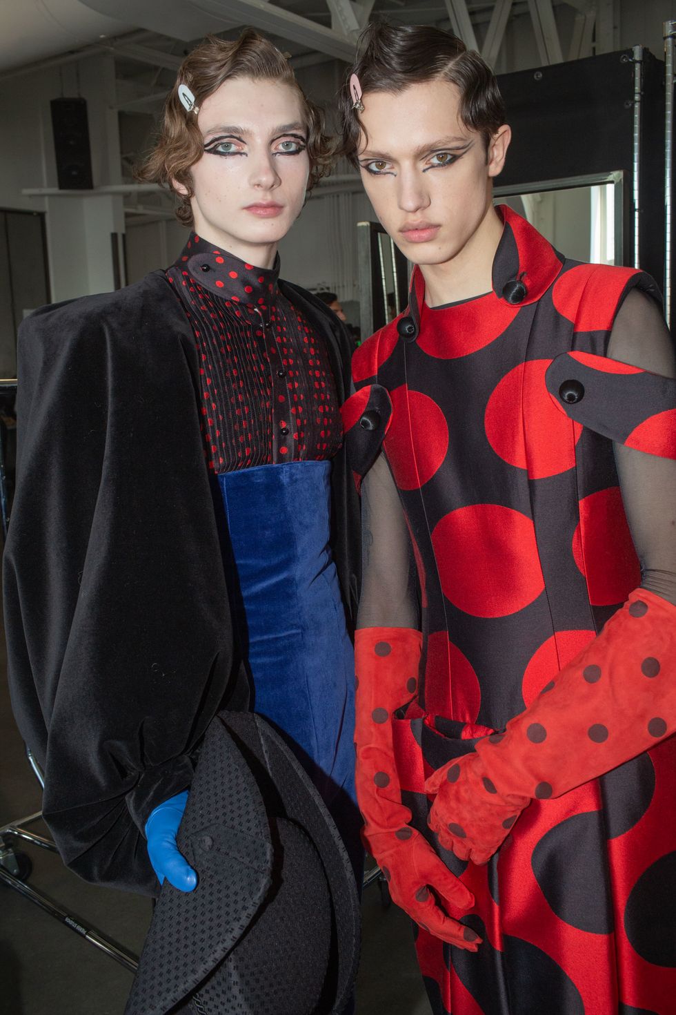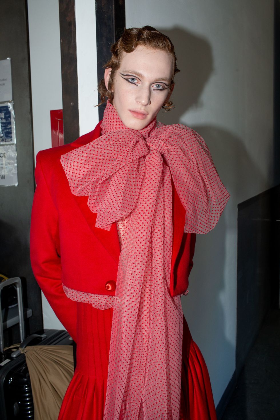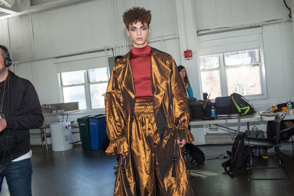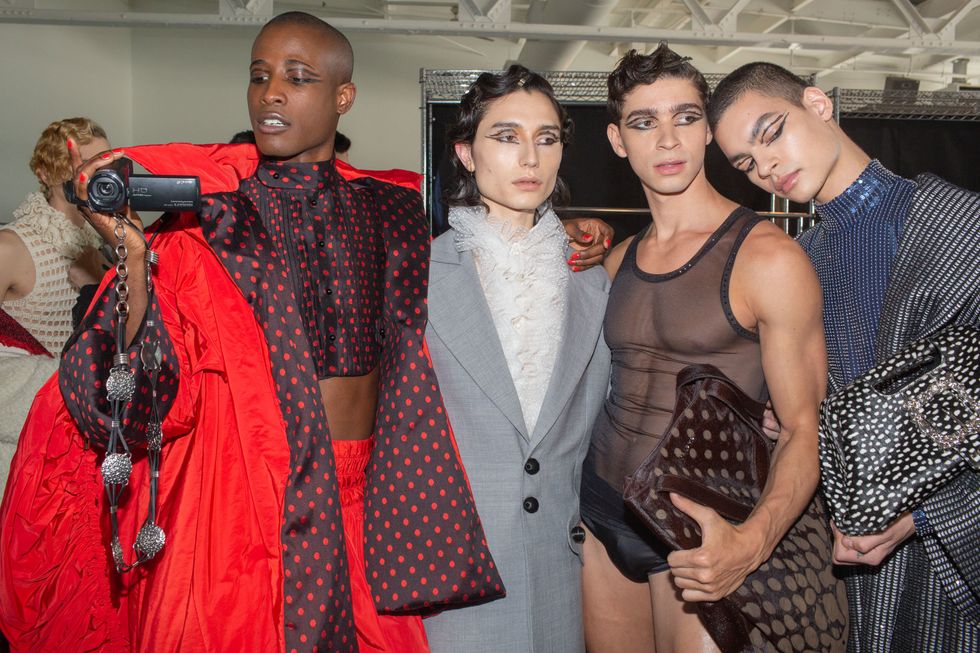 Backstage at Palomo Spain, designer Alejandro Gómez Palomo was putting the final touches on the models for his fall 2019 show. MAC makeup artists applied tiny polka dots all over models' faces in addition to dramatic, mod-inspired cat eyes. The label's eighth collection included Richie Shazam and other cool kids and unconventional models wearing ruffled collars, opera gloves and oversized polka dot pieces. As for the inspiration, Palomo called the collection "1916," and took cues from the historical period when the Ballets Russes came to Spain.
