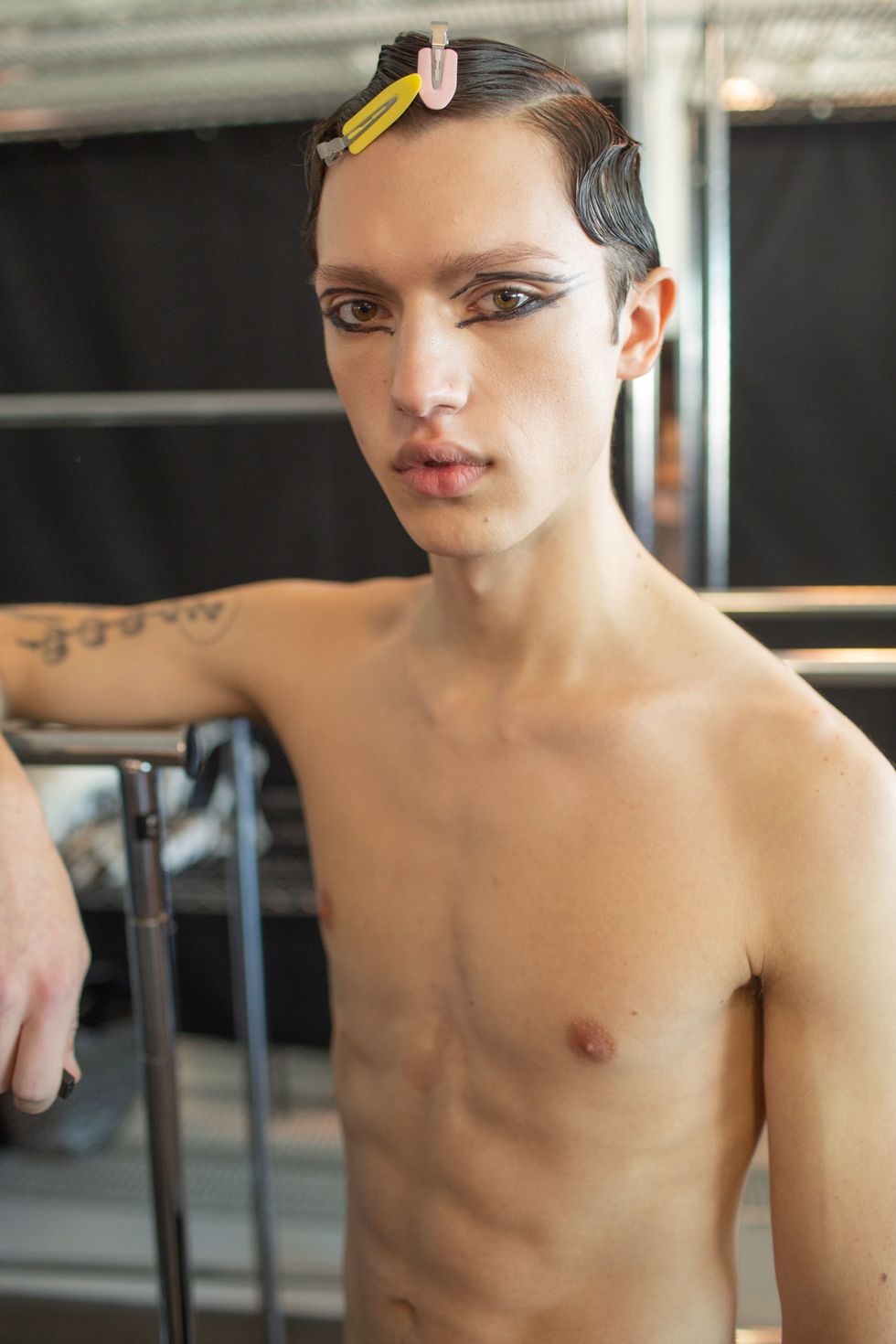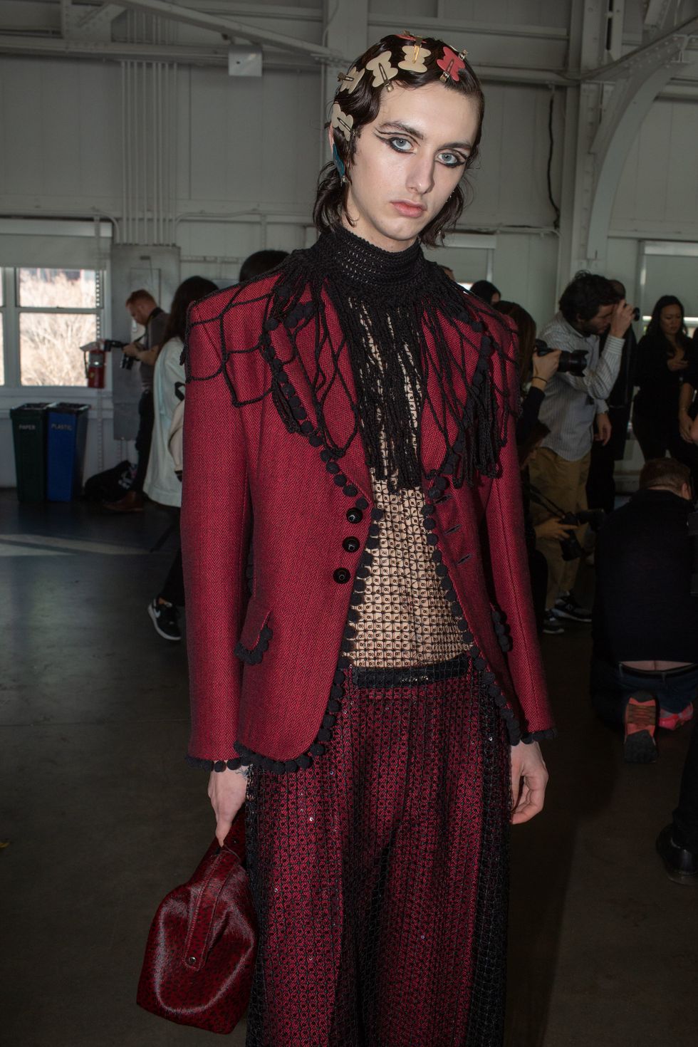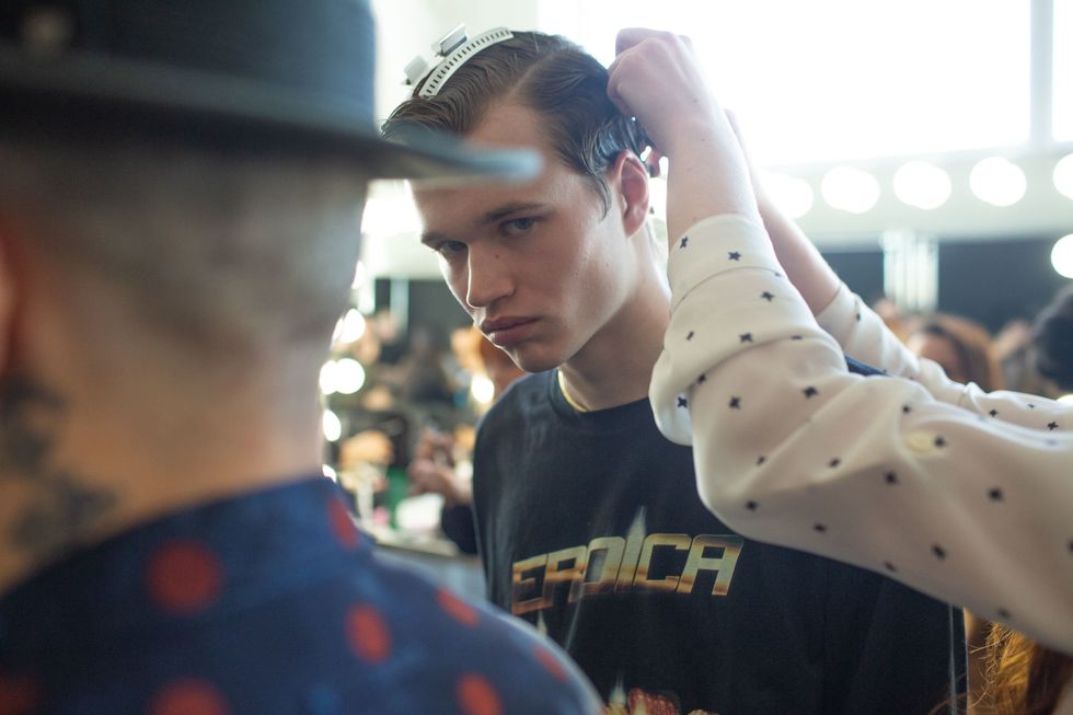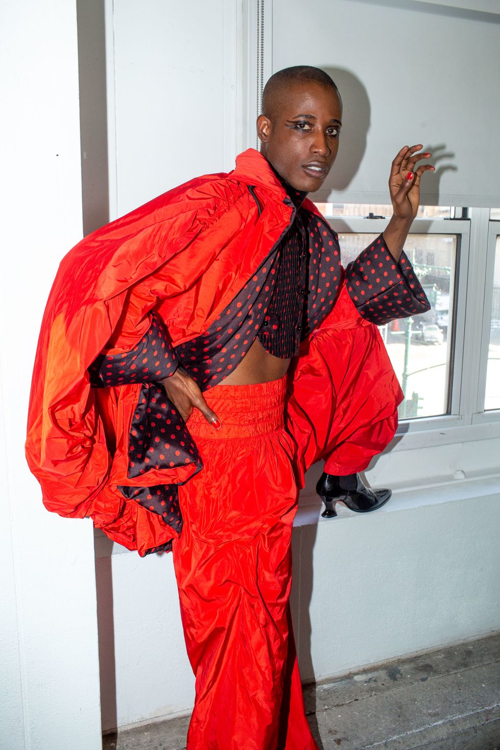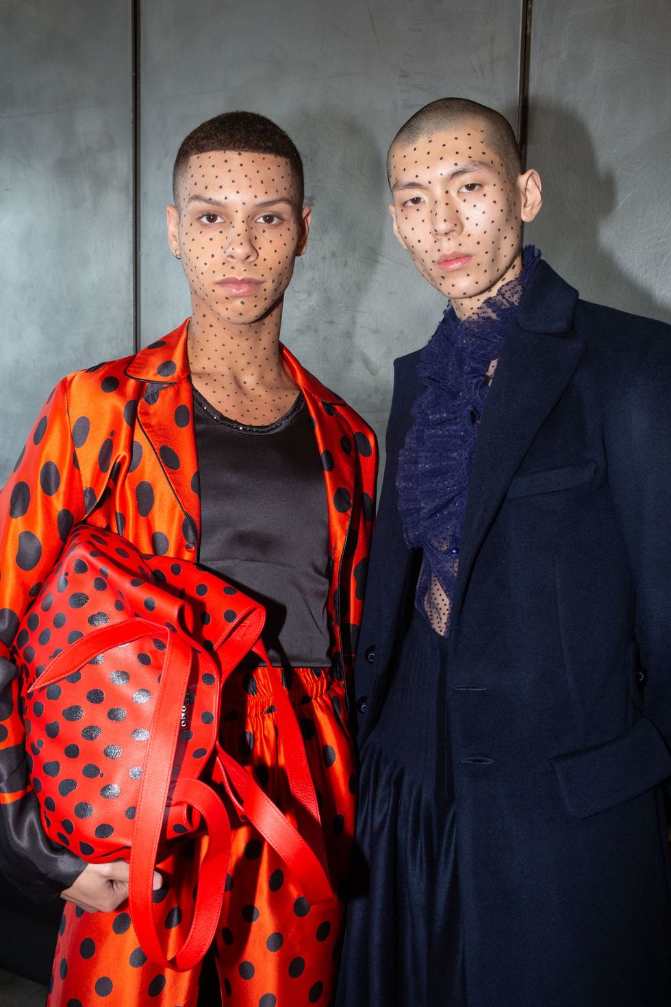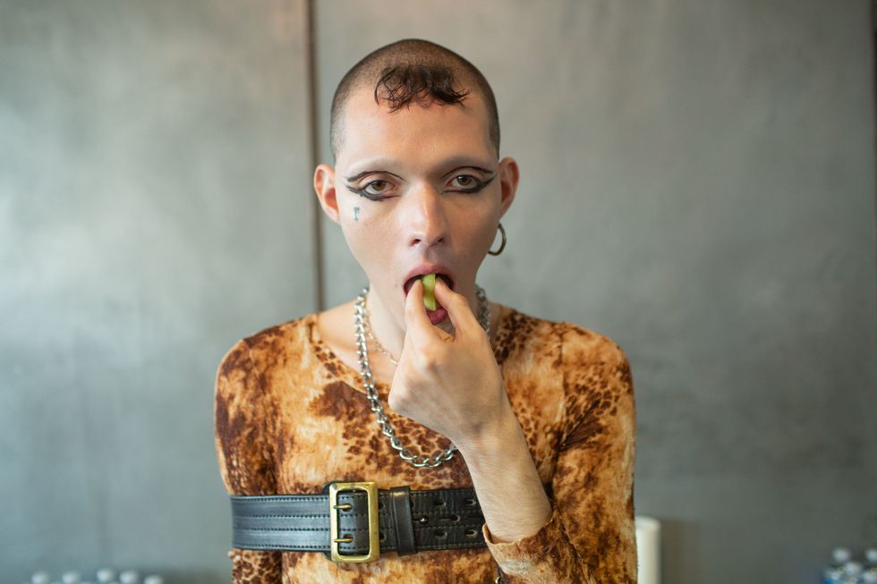 Backstage at Palomo Spain, designer Alejandro Gómez Palomo was putting the final touches on the models for his fall 2019 show. MAC makeup artists applied tiny polka dots all over models' faces in addition to dramatic, mod-inspired cat eyes. The label's eighth collection included Richie Shazam and other cool kids and unconventional models wearing ruffled collars, opera gloves and oversized polka dot pieces. As for the inspiration, Palomo called the collection "1916," and took cues from the historical period when the Ballets Russes came to Spain.