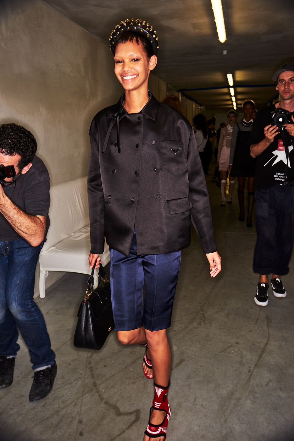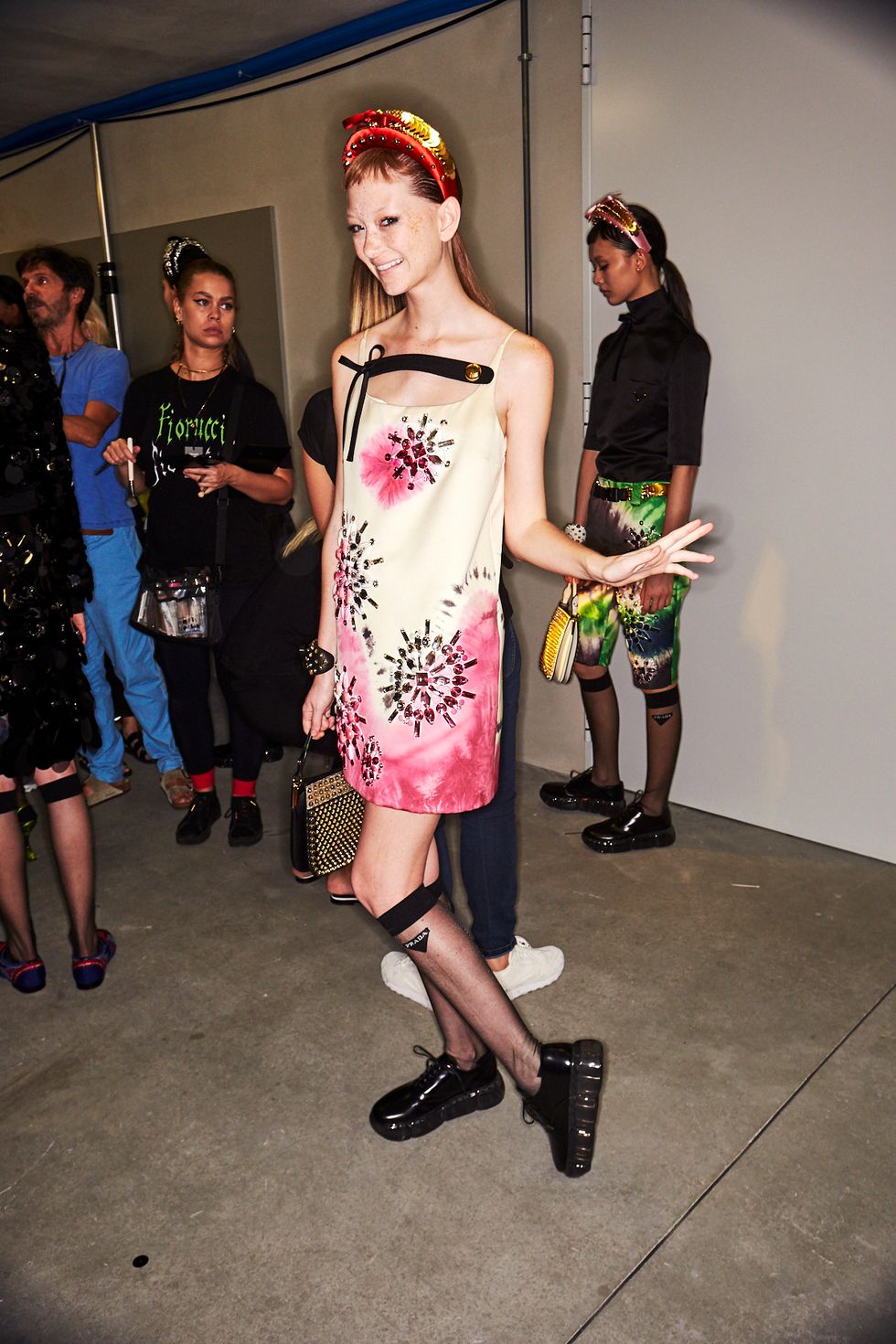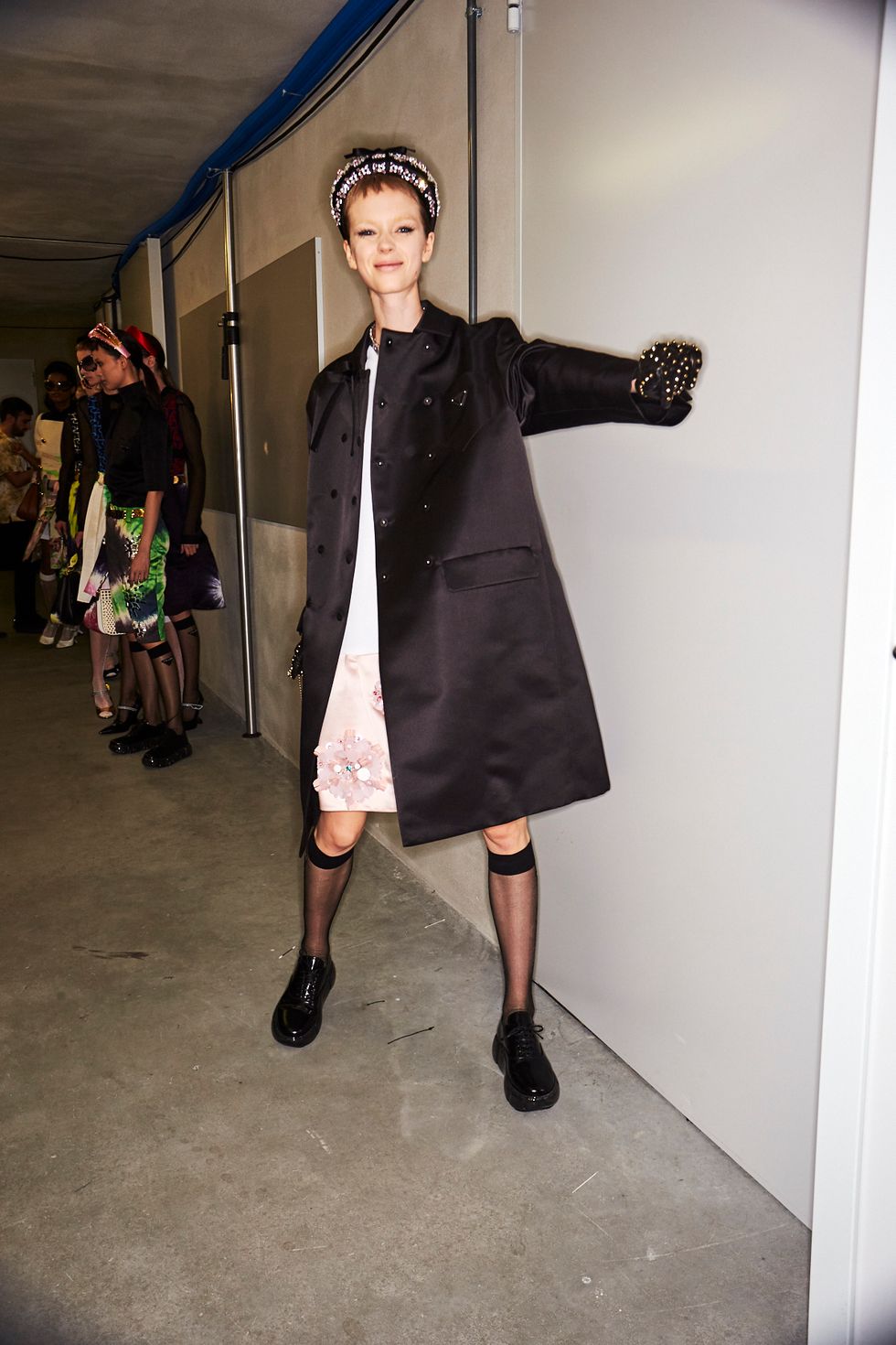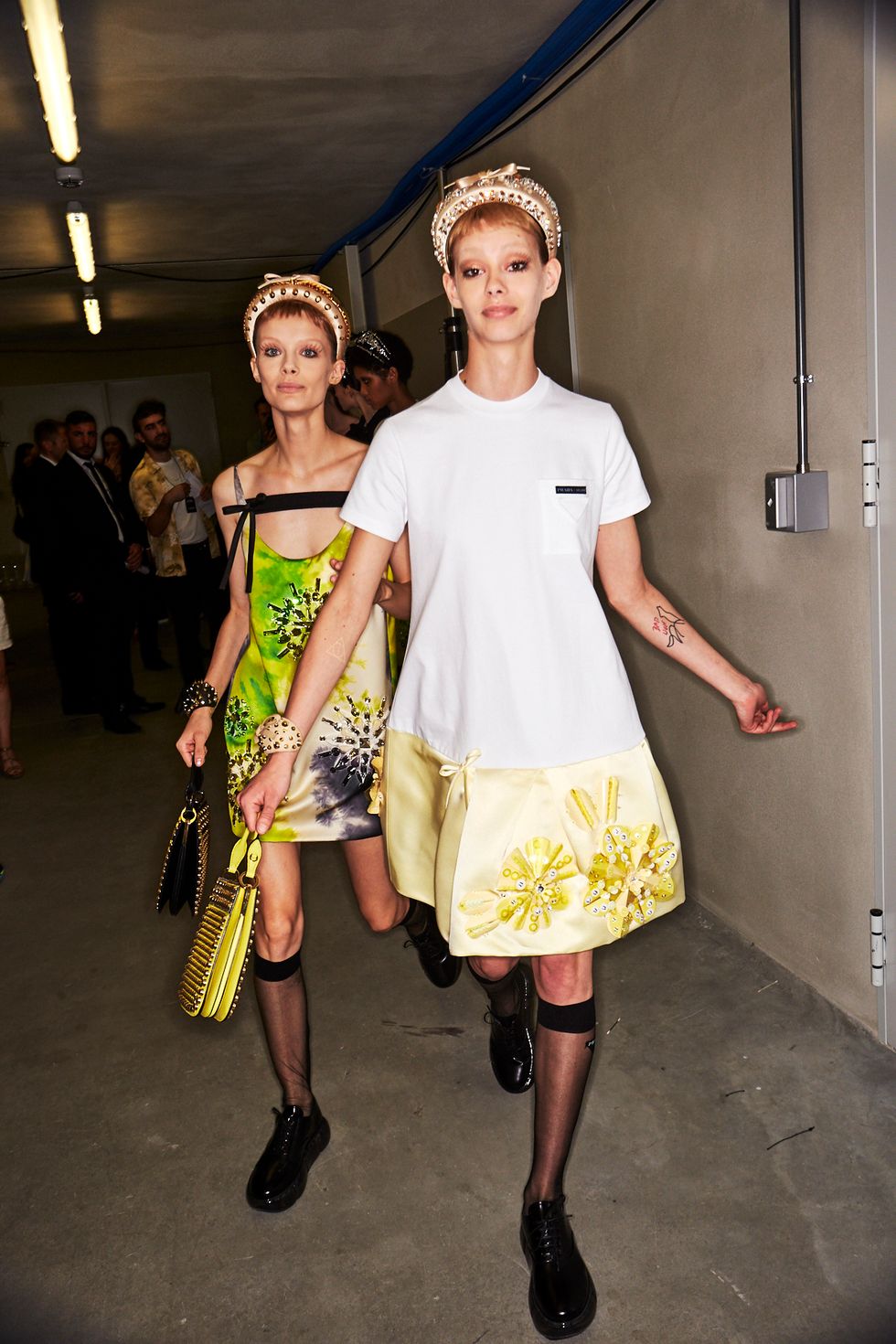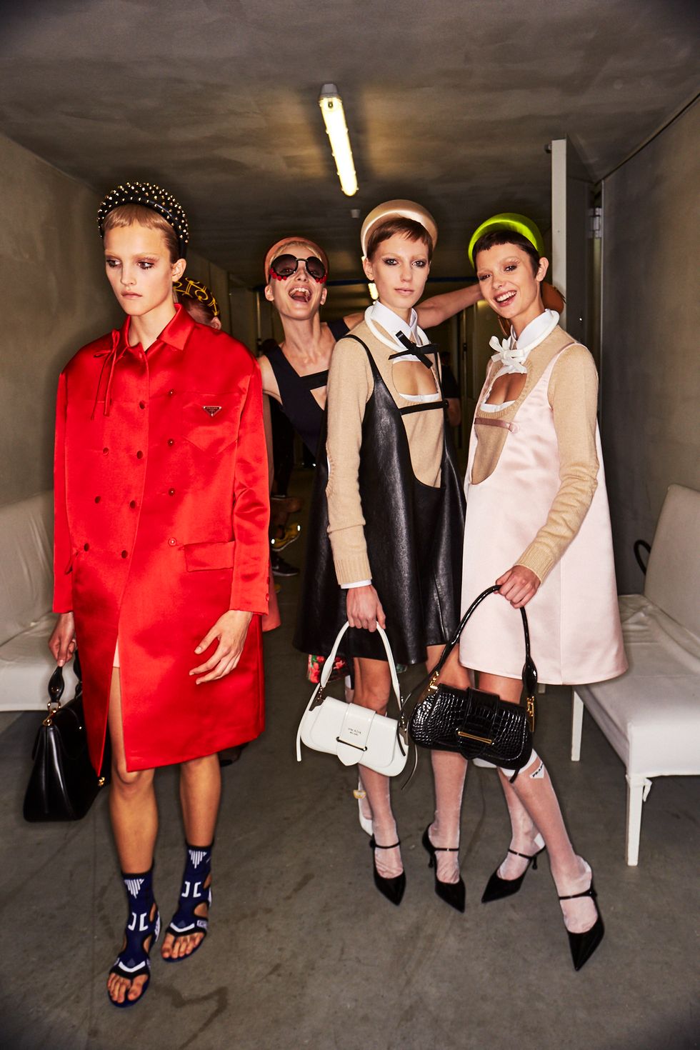 Miuccia Prada's nod to ladylike '60s dressing was punctuated by bright colors and youthful details. Fittingly, the designer enlisted a spritely cast including Anok Yai, Lexi Boling, and Sara Grace Wallerstedt to model her latest womenswear collection. Get a behind the scenes look at Prada's Spring 2019 show, below.
