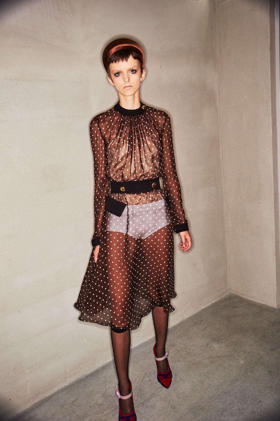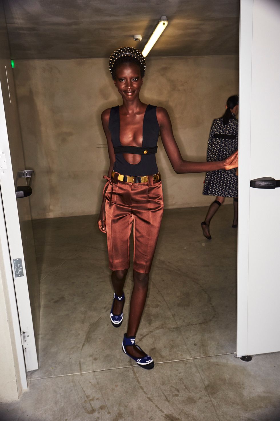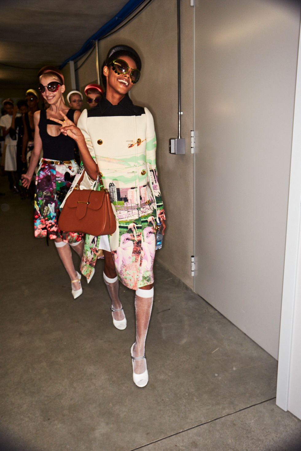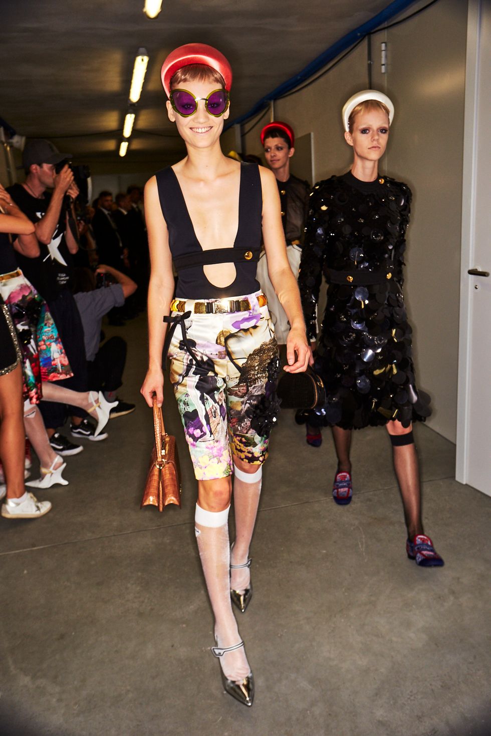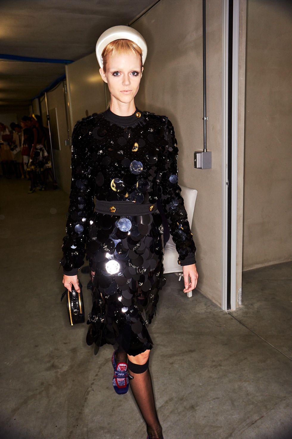 Miuccia Prada's nod to ladylike '60s dressing was punctuated by bright colors and youthful details. Fittingly, the designer enlisted a spritely cast including Anok Yai, Lexi Boling, and Sara Grace Wallerstedt to model her latest womenswear collection. Get a behind the scenes look at Prada's Spring 2019 show, below.