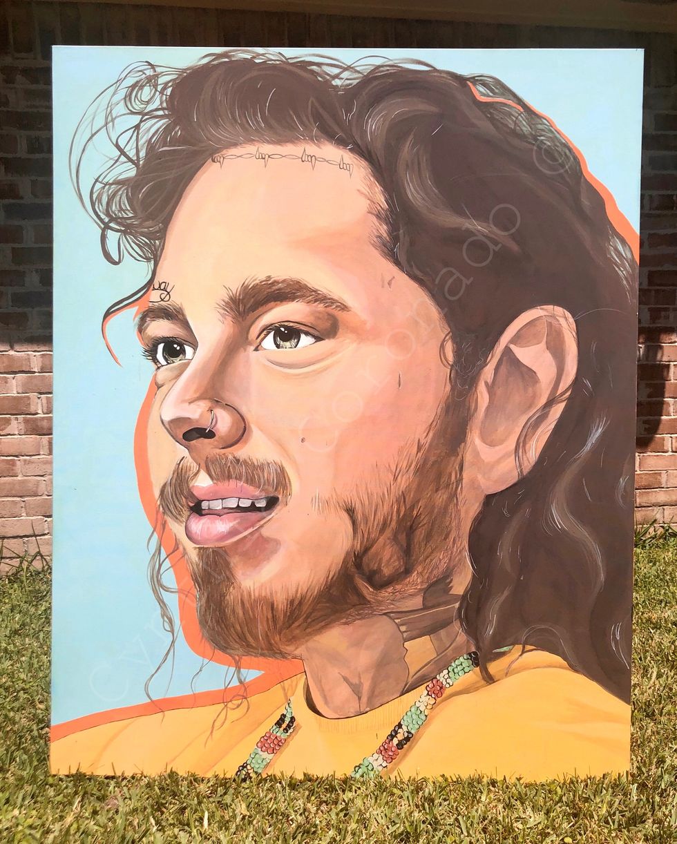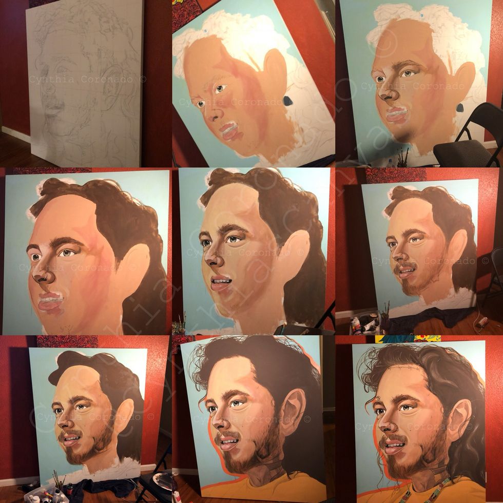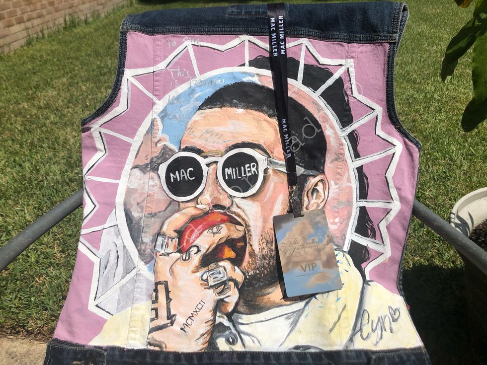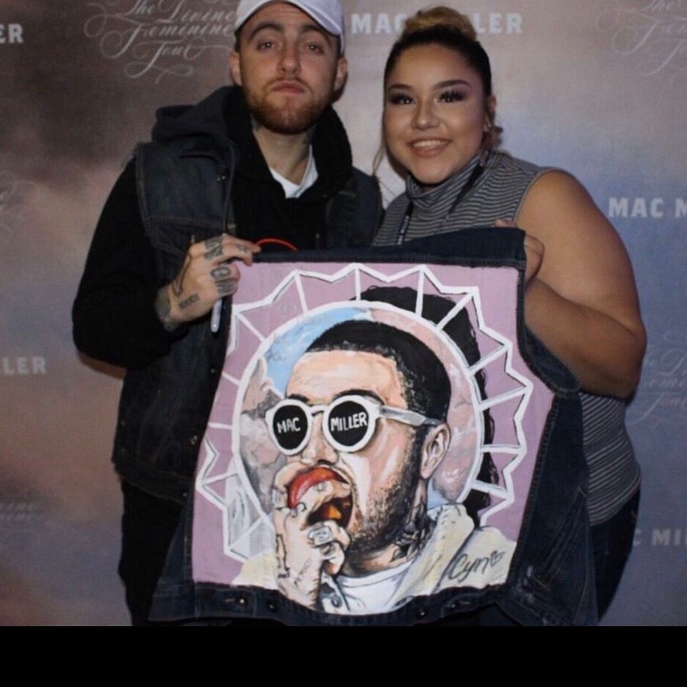 Yes, many of my paintings are of artists. I actually got the opportunity to do a meet and greet with Mac Miller before his passing and I did two artworks of him on the back of two jackets. He kept one and I got to keep the other one, with his signature and a message that said, "Cyn, This is beautiful Keep going!" I also was recognized, on my old Twitter account that's been deleted, by Post Malone. I am currently working on a collection of Latin artists. Benito was the first piece.