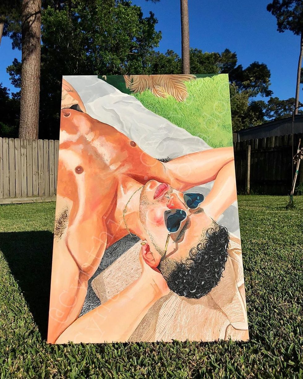 Coronado has been a Bad Bunny fan for years. She doesn't count herself as a part of the standom due to her offline status, but that doesn't mean she's not dedicated. "I would do everything I could to support him and his work," she tells PAPER. She only made a Twitter this month to post her artwork. After being laid off from her job at an auto shop due to the COVID-19 pandemic, she's been using her spare time to paint and found one particular image of Bad Bunny, a sun-kissed thirst trap he posted last month, understandably... inspiring.