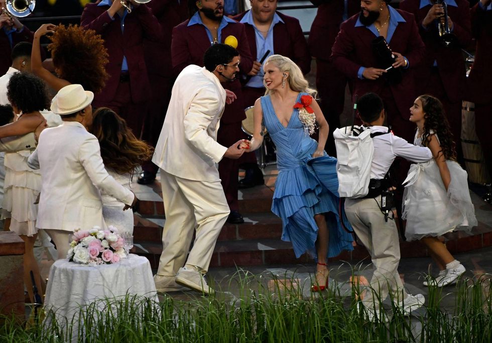 The halftime show’s production was led by creative director Cuddeford and show designer Yellow Studio, who took Levi’s Stadium and transformed it into an ambitious, sprawling depiction of Puerto Rico. Unlike the traditional stage the halftime show has become known for in its lengthy history, the entire field became an immersive landscape and experience, with sugarcane fields, towering electrical poles, casitas — even a wedding, presided over by Bad Bunny and Lady Gaga.