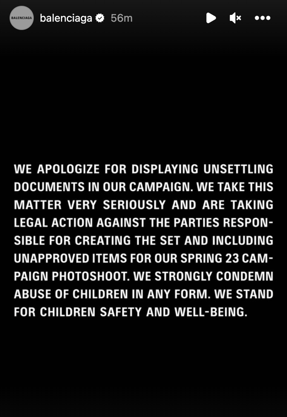 Balenciaga addressed the document in a separate Instagram Story: "We apologize for displaying unsettling documents in our campaign. We take this matter very seriously and are taking legal action against the parties responsible for creating the set and including unapproved items for our Spring 23 campaign photoshoot. We strongly condemn abuse of children in any form. We stand for children safety and well-being."