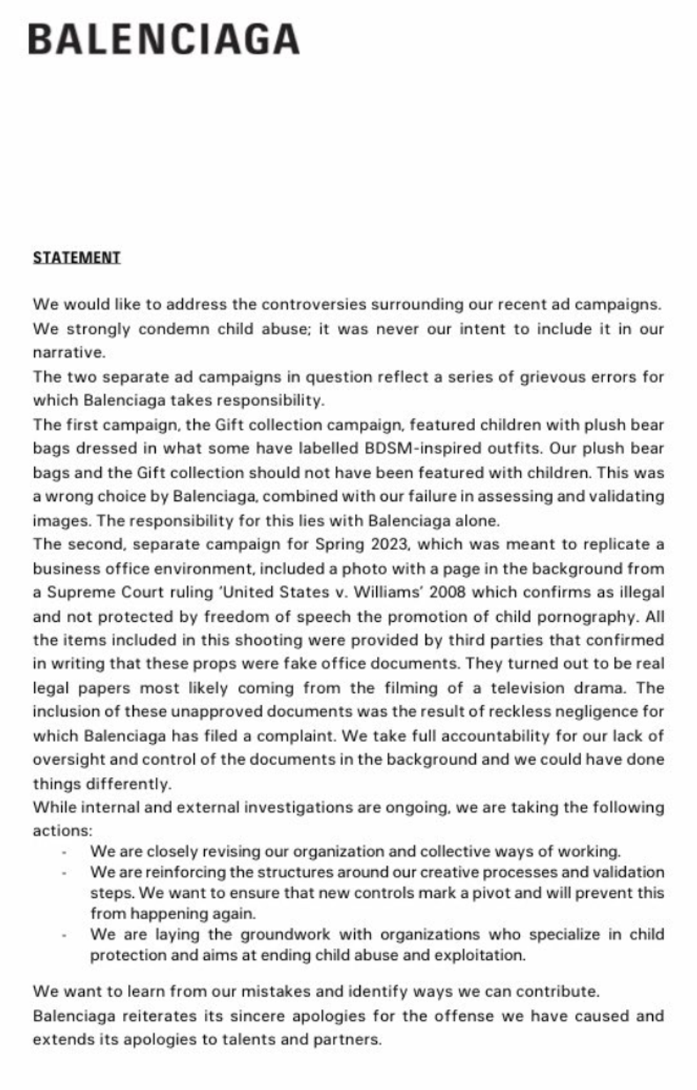 Updated 11/28/22: Balenciaga has released an additional statement today over its controversial campaigns after they posted apologies on social media last week. In the statement, below, the company takes sole responsibility for the teddy bear campaign while blaming third parties for the use of props in another campaign, including the child abuse court case, for which it has filed a lawsuit.