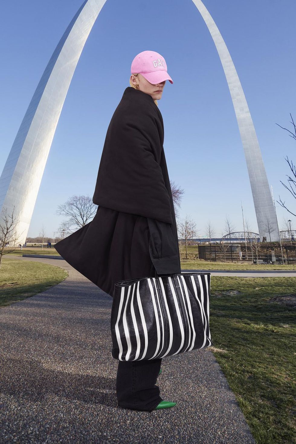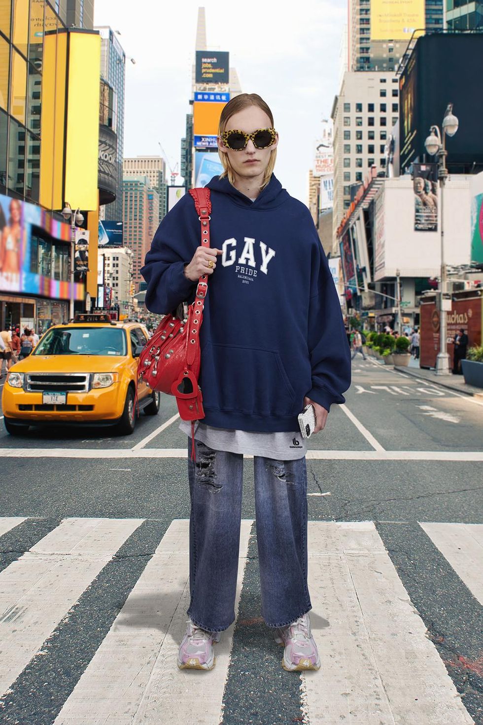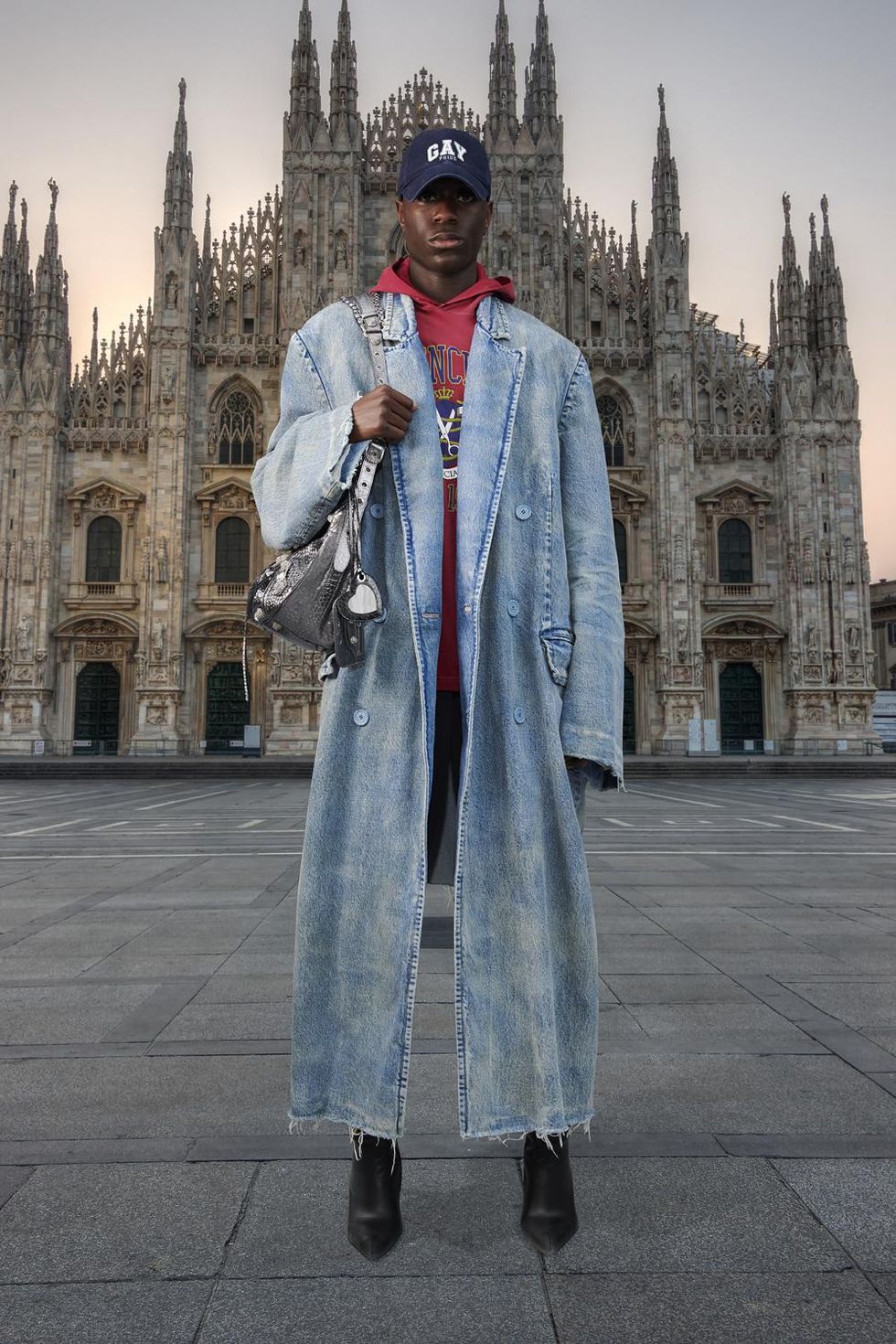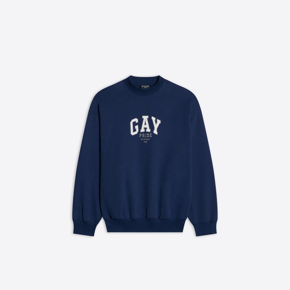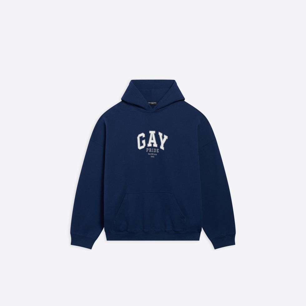 There's also sports bras, baseball caps, boxers, t-shirts and hoodies with "GAY" printed across whose varsity letter font resembles a certain American mall brand. The capsule first debuted last month as part of Balenciaga's Pre-Fall 2021 collection, which saw models standing in front of various famous travel landmarks.