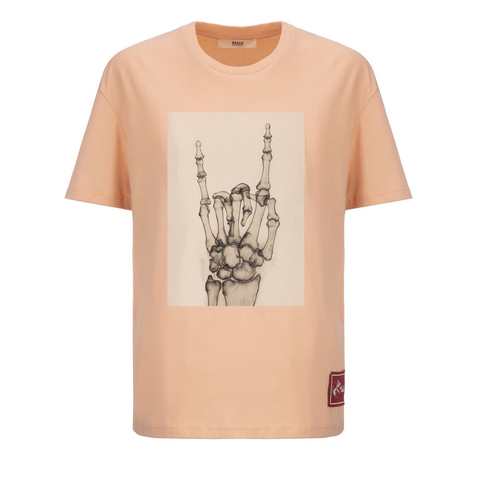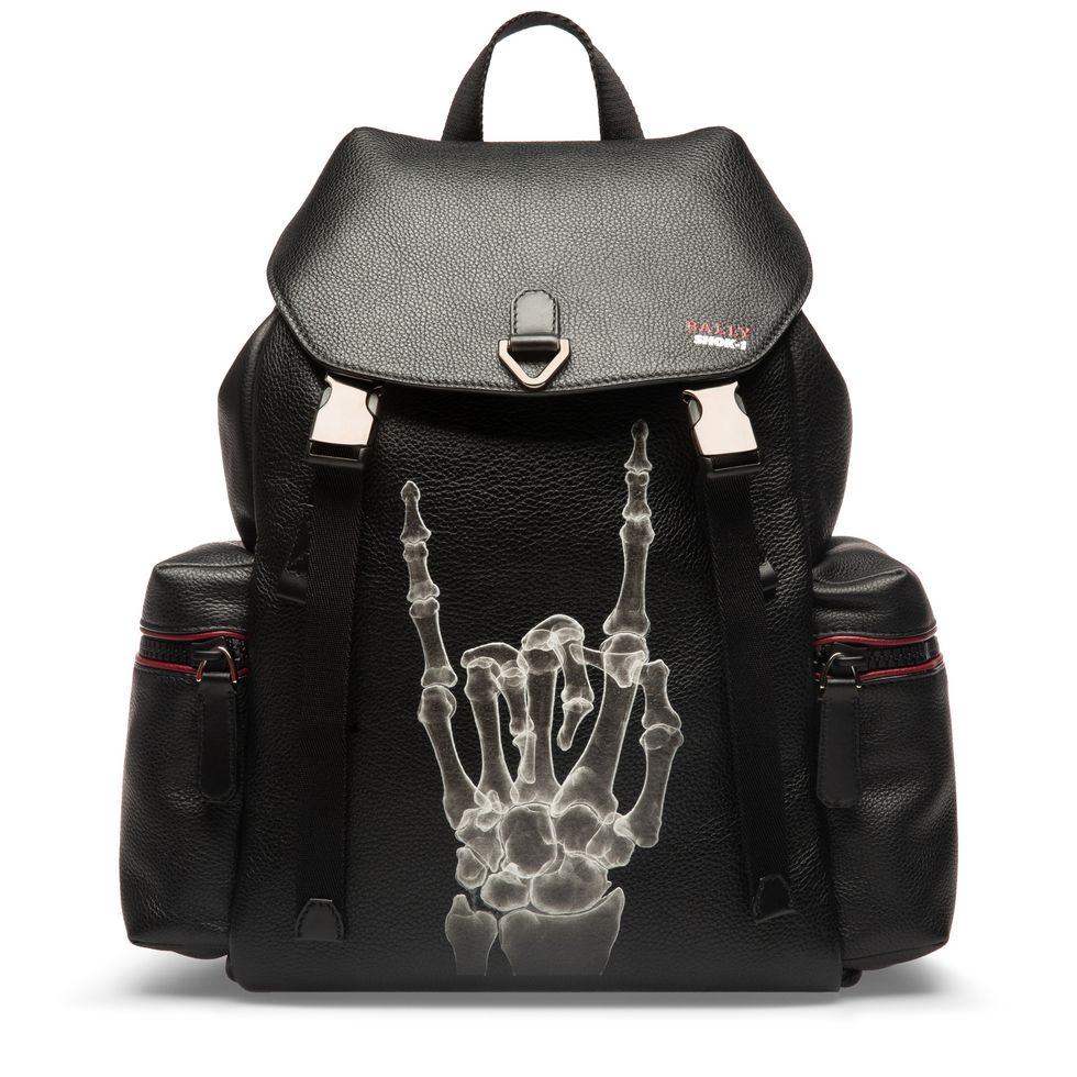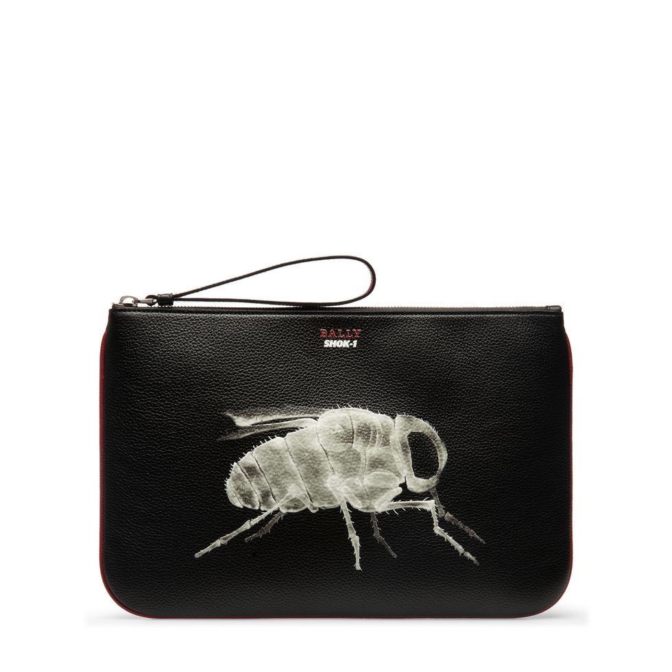 In his capsule with Bally, scans of a fruit fly, a human hand, and a skull manipulated to look like Pac-Man are printed onto a range of accessories, sneakers, and ready-to-wear rendered in black and peach. The motifs allude to a time when artists including Slick Rick, Doug E. Fresh, and Kasseem Dean (a.k.a. Swizz Beatz) became devoted Bally fans, nodding to the longstanding practice of subcultures adopting brands that weren't originally meant for them.
