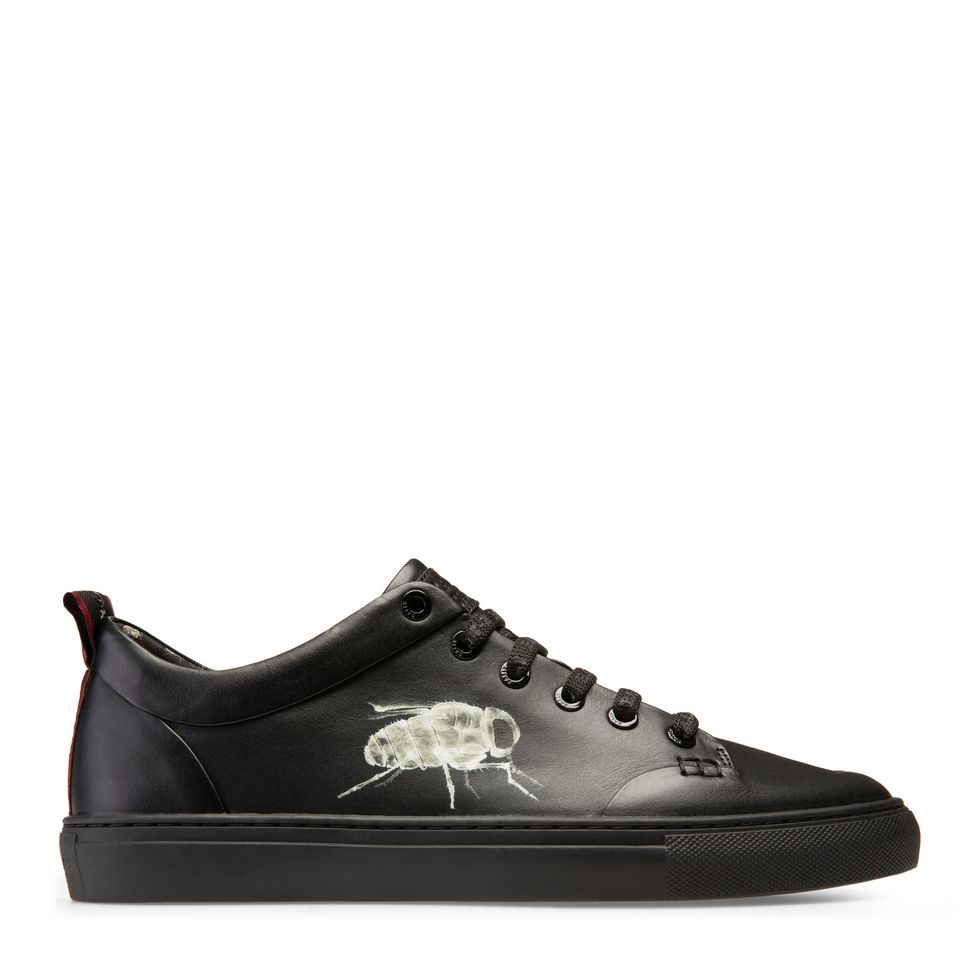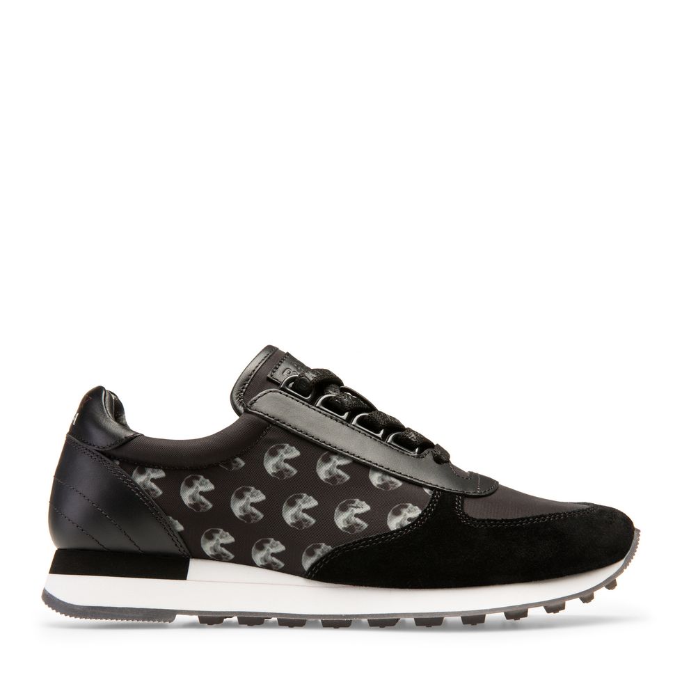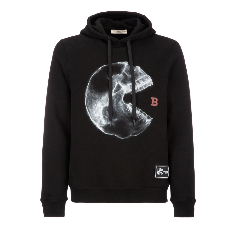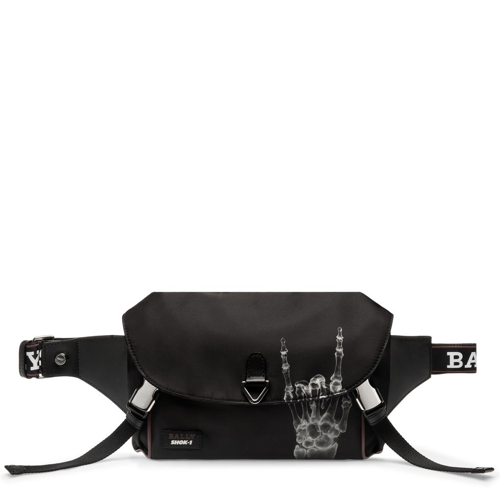 In his capsule with Bally, scans of a fruit fly, a human hand, and a skull manipulated to look like Pac-Man are printed onto a range of accessories, sneakers, and ready-to-wear rendered in black and peach. The motifs allude to a time when artists including Slick Rick, Doug E. Fresh, and Kasseem Dean (a.k.a. Swizz Beatz) became devoted Bally fans, nodding to the longstanding practice of subcultures adopting brands that weren't originally meant for them.
