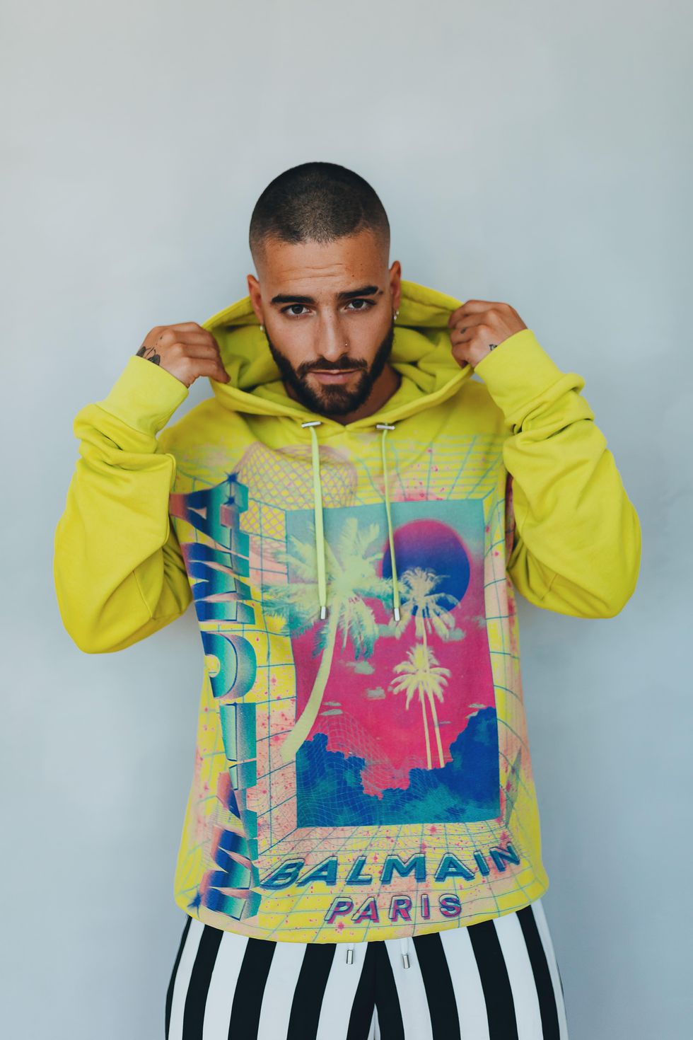 Balmain x Maluma is a collection of ready-to-wear and sneakers full of bright, tropical colors as well as black and white stripes inspired by Miami style. The partnership was originally intended for Maluma's tour, which was postponed due to the pandemic, so they extended their collaboration as a special, limited-edition capsule.