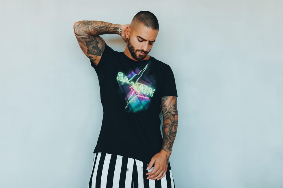 At last year's VMAs, Maluma took the stage to perform his hit song "Hawaii" in a neon yellow suit from Balmain's forthcoming menswear collection. The fashion preview would ultimately form the start of a wider collaboration between the Colombian singer and Balmain creative director Olivier Rousteing, which is being unveiled today.