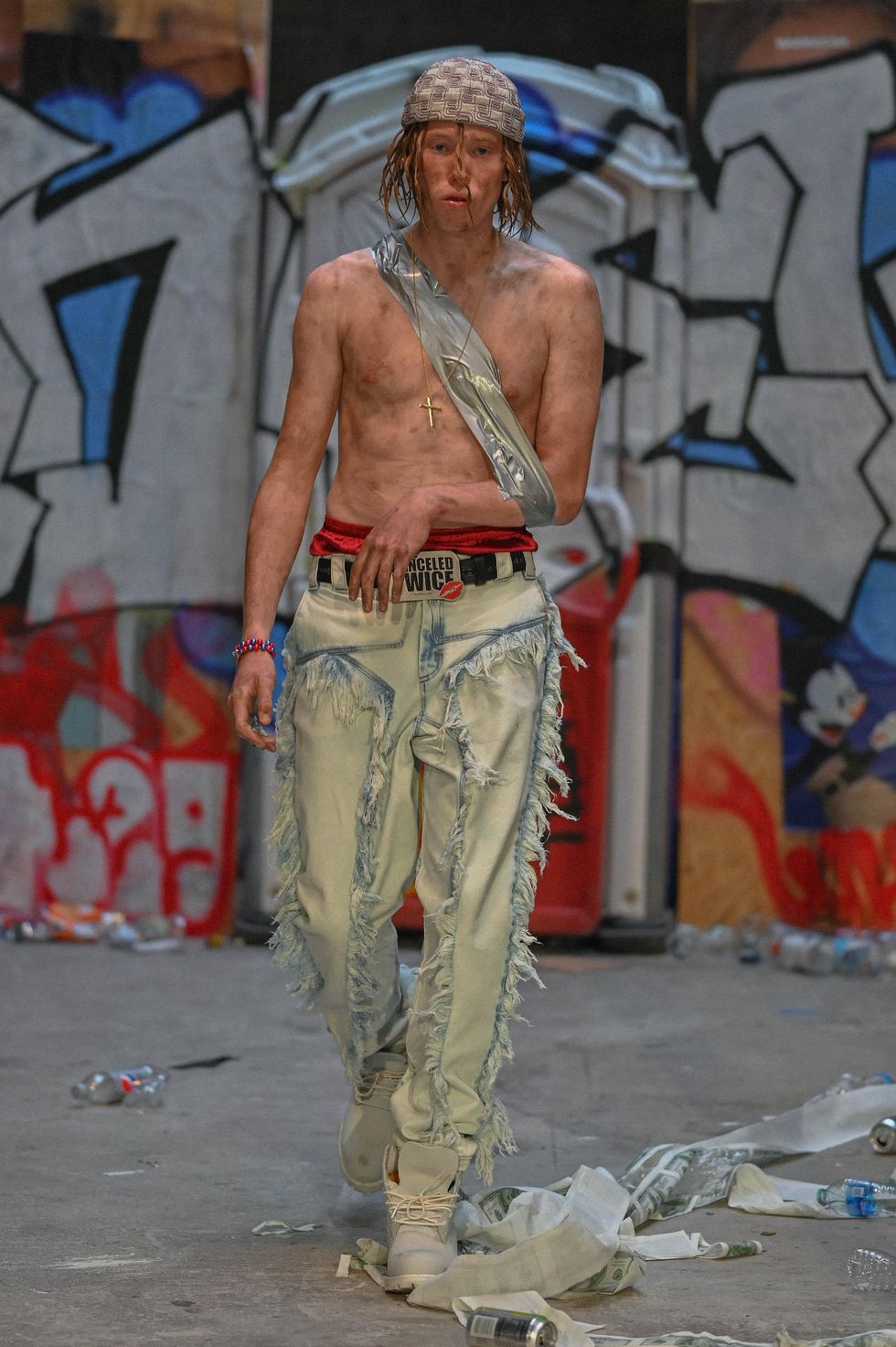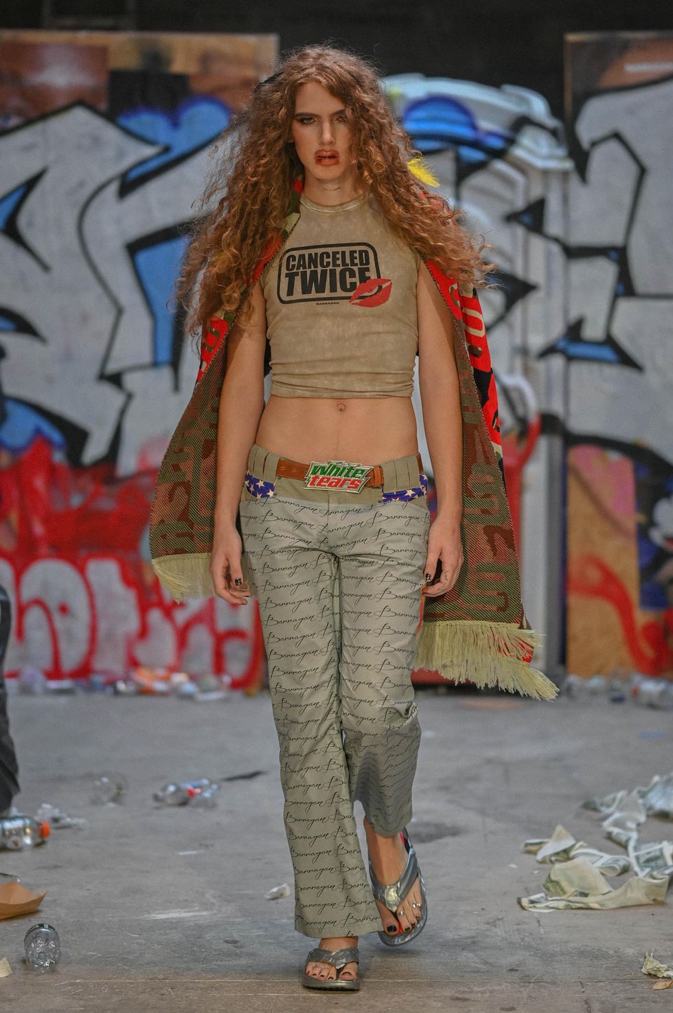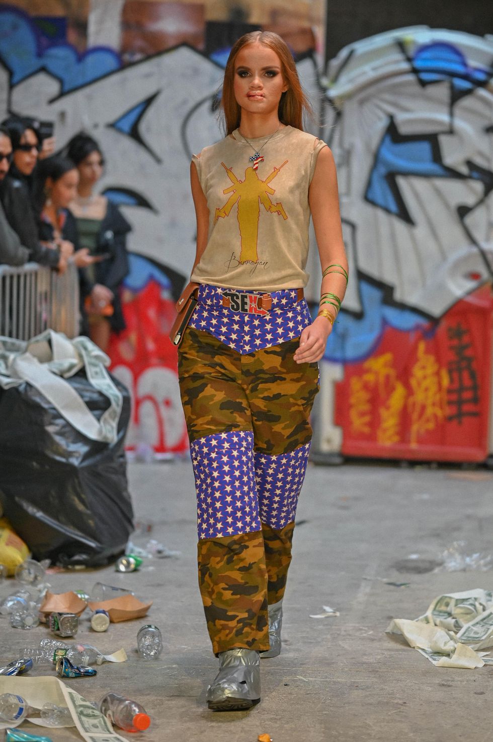 There’s nothing more American than information overload, and Victor Barragán’s return to NYFW captured this chaos spot on. Remember the last TikTok you watched? The last headline you read? Can you make it to the bottom of this article without distraction? What should I order on Uber Ea– Construction fencing covered the walls, layered with penis-shaped graffiti, old iconic cartoons, newspaper clippings and the brand’s own advertisements. Guests stood behind metal barricades, with trash covering the floor: Water bottles, dollar bills, metal cans and food trays. Walking right off the streets of New York, the inside didn’t look much different — all intentional, of course.