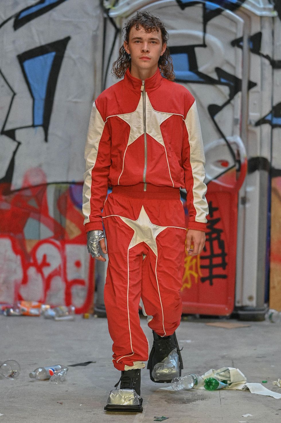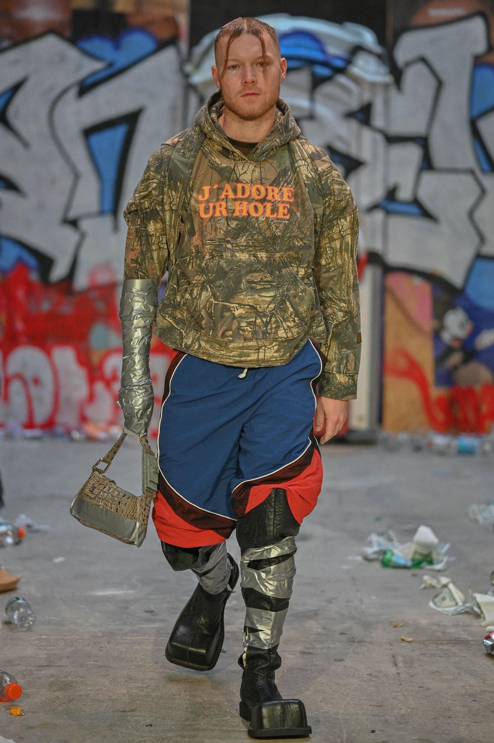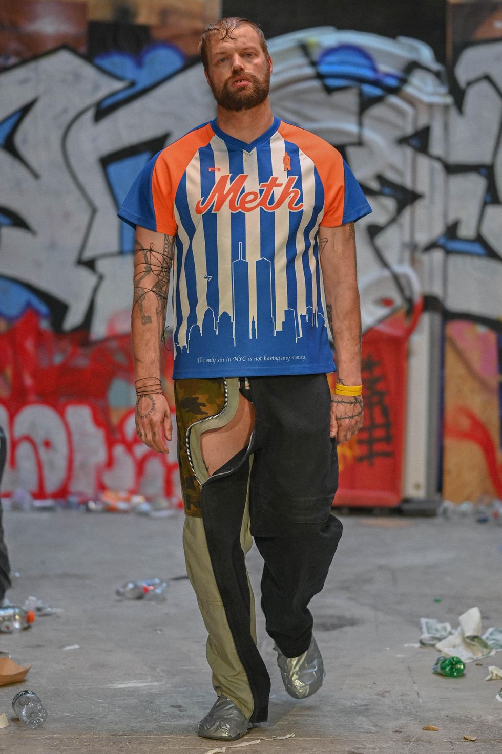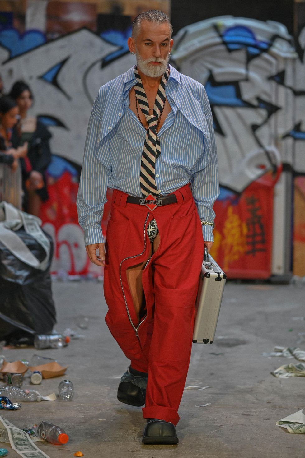As if to also feed the beast he was critiquing, Barragán’s collection included several pieces that’d immediately go viral on any feed — no nuance or context required. (And they did.) “Meth” and “Canceled Twice” were printed on buckle belts and t-shirts, the latter of which was worn days after by Doja Cat at a Fashion Week afterparty. “The only sin in NYC is not having any money,” one shirt declared, designed to appropriate sports jerseys. Another hoodie said “J’Adore Ur Hole.” The silver-haired model wore a belt that read, “Homophobe,” inches above unzipped trousers to reveal briefs with the brand logo repeated across. Barragán’s designs are always sexy and this time that meant perversions of corporate office wear (ties, pinstriped shirts, briefcases).