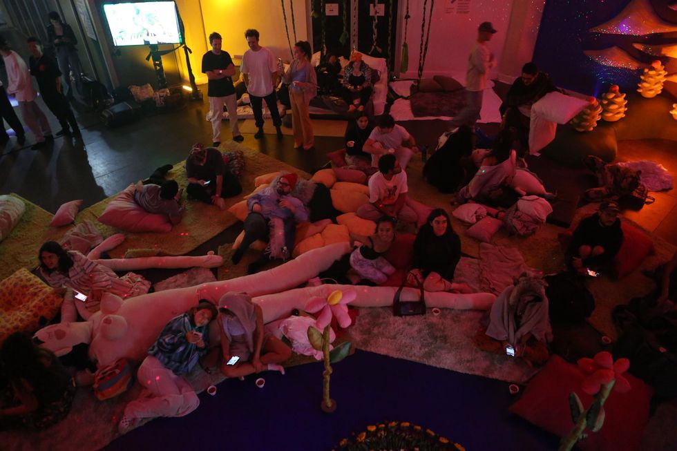However, it was the otherworldly art that really transformed the sleepover into an intimate space that truly felt like a reprieve from all of the art world chaos outside. Drenched in magical magenta light and pinpoint projections that made it look like you were staring up at the night sky, the room was also filled with works by Elena Stonaker, Juliet Johnstone, TOMBOGO, R3N3GADES and Danny Cole that were displayed alongside Basic.Space's IRL marketplace, where attendees were able to browse and shop a vast collection of curated items, including vintage clothes, pre-owned home goods and carefully selected art.