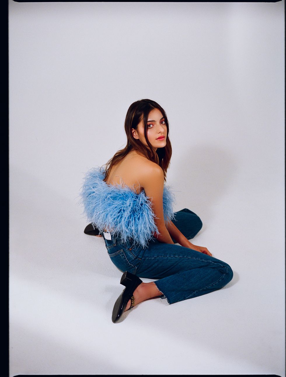 Top by Adam Selman, Jeans by RE/DONE Originals, Shoes by Christian Dior