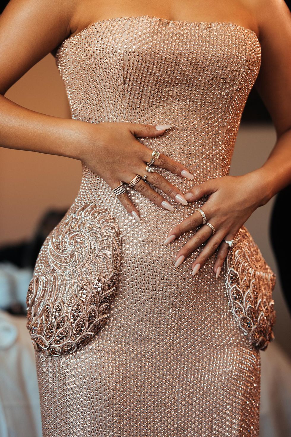 My dress was custom Etro. And for my first Oscars, that was really special for me. As soon as I saw it, I immediately loved the rose gold color and the fact that it had pockets! Each crystal is embroidered, and you can tell that attention to detail was super important to the Etro team.