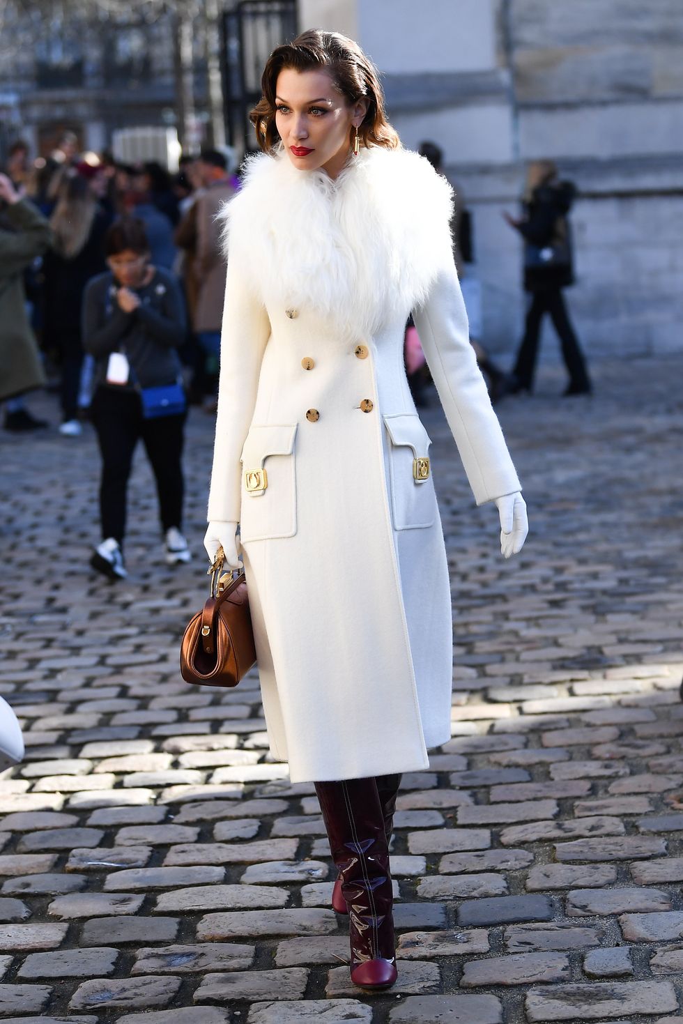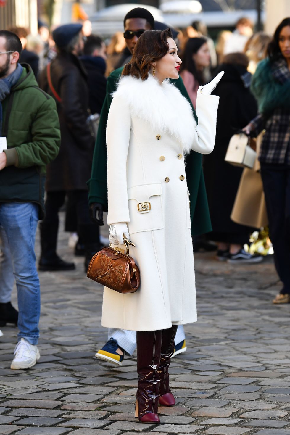The winter white coat with shearling collar, matching gloves and knee-high oxblood boots were serving you Meredith Blake realness with that perfectly coifed '60s hairdo and bold red lop. She looked ever bit the glamorous doll with her gold earrings and ladylike bag.