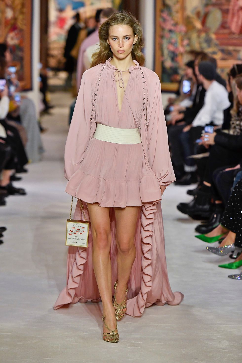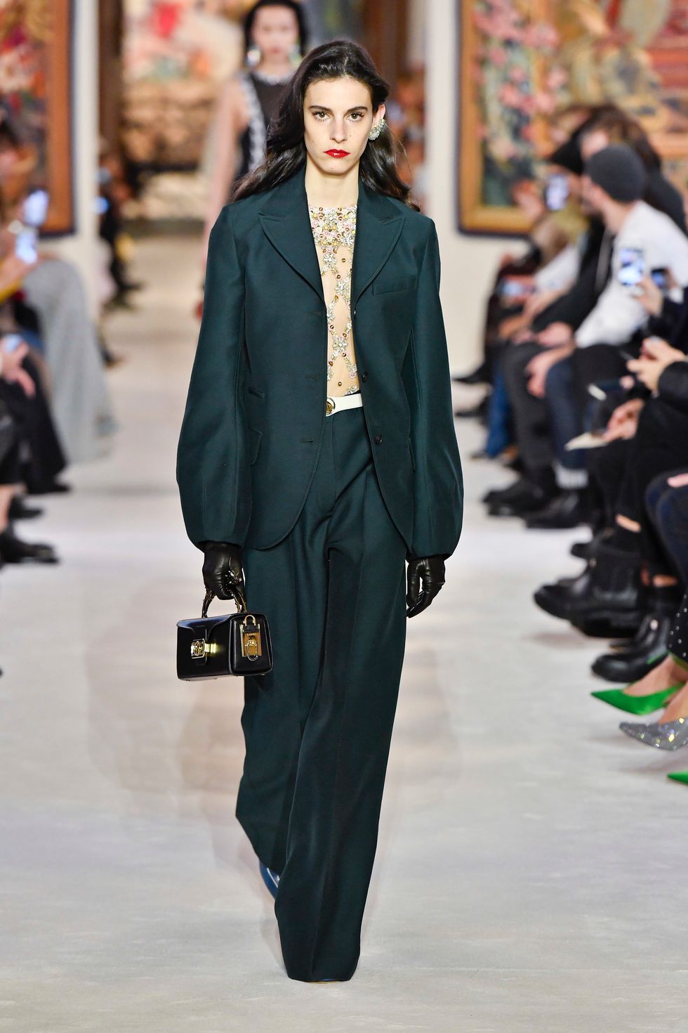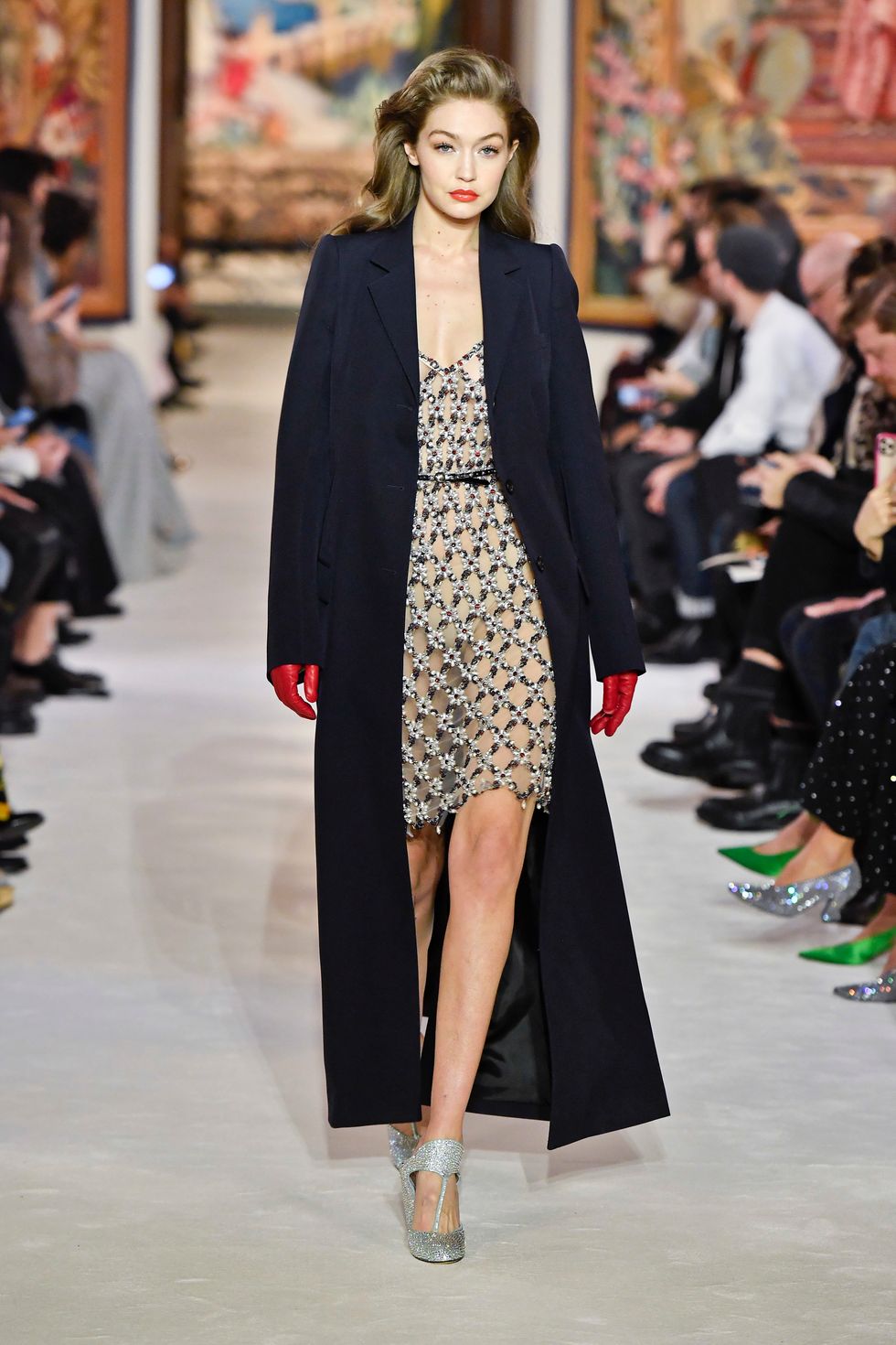 Her sister Gigi also walked the Lanvin show, closing it out in a sheer dress, floor-length coat and leather opera gloves (a recurring trend this season). This was Creative Director Bruno Sialelli's third collection for the luxury fashion house, which featured wispy ruffled dresses, elongated silhouettes and colorful leather capes.