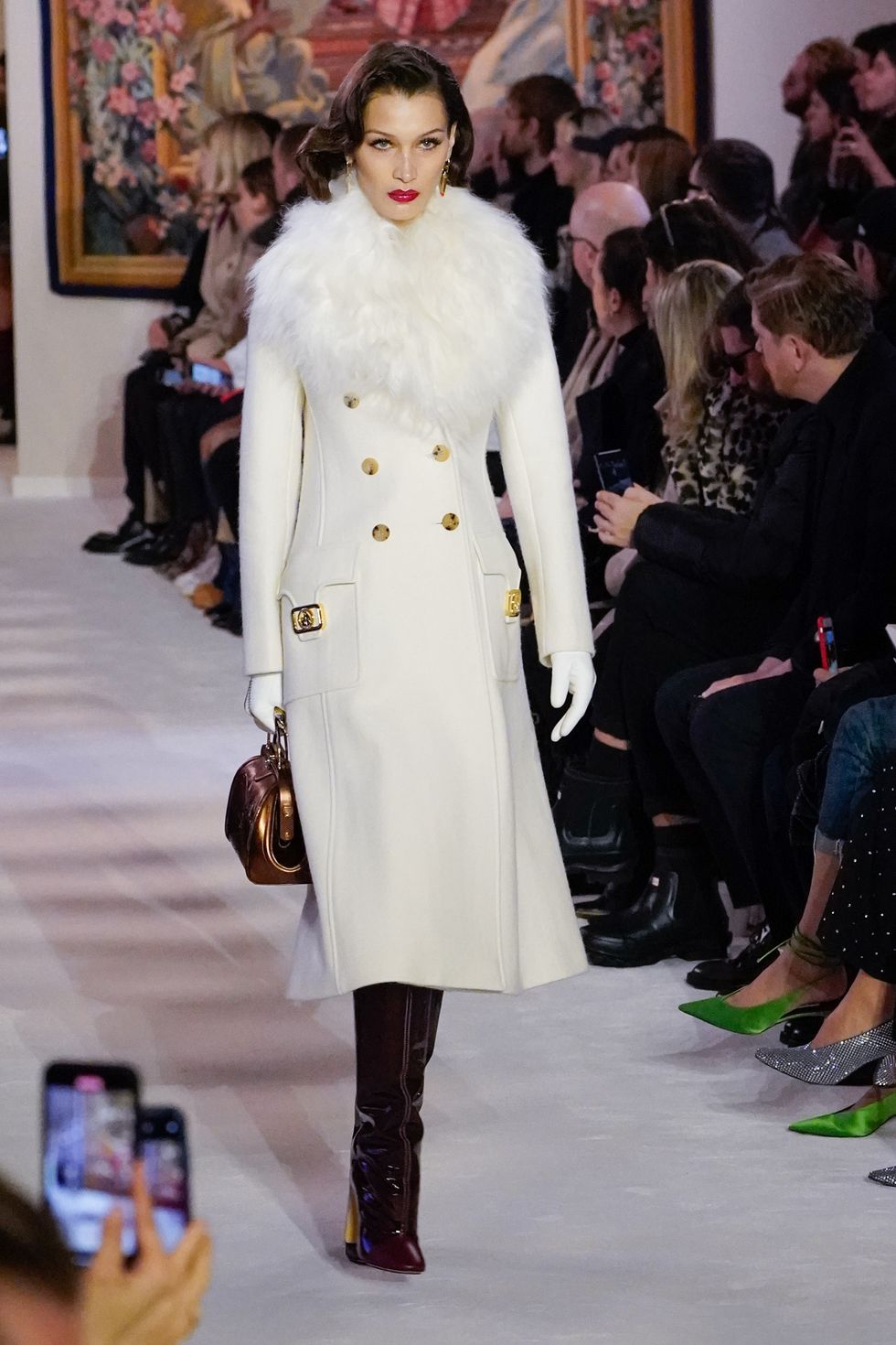 Her sister Gigi also walked the Lanvin show, closing it out in a sheer dress, floor-length coat and leather opera gloves (a recurring trend this season). This was Creative Director Bruno Sialelli's third collection for the luxury fashion house, which featured wispy ruffled dresses, elongated silhouettes and colorful leather capes.