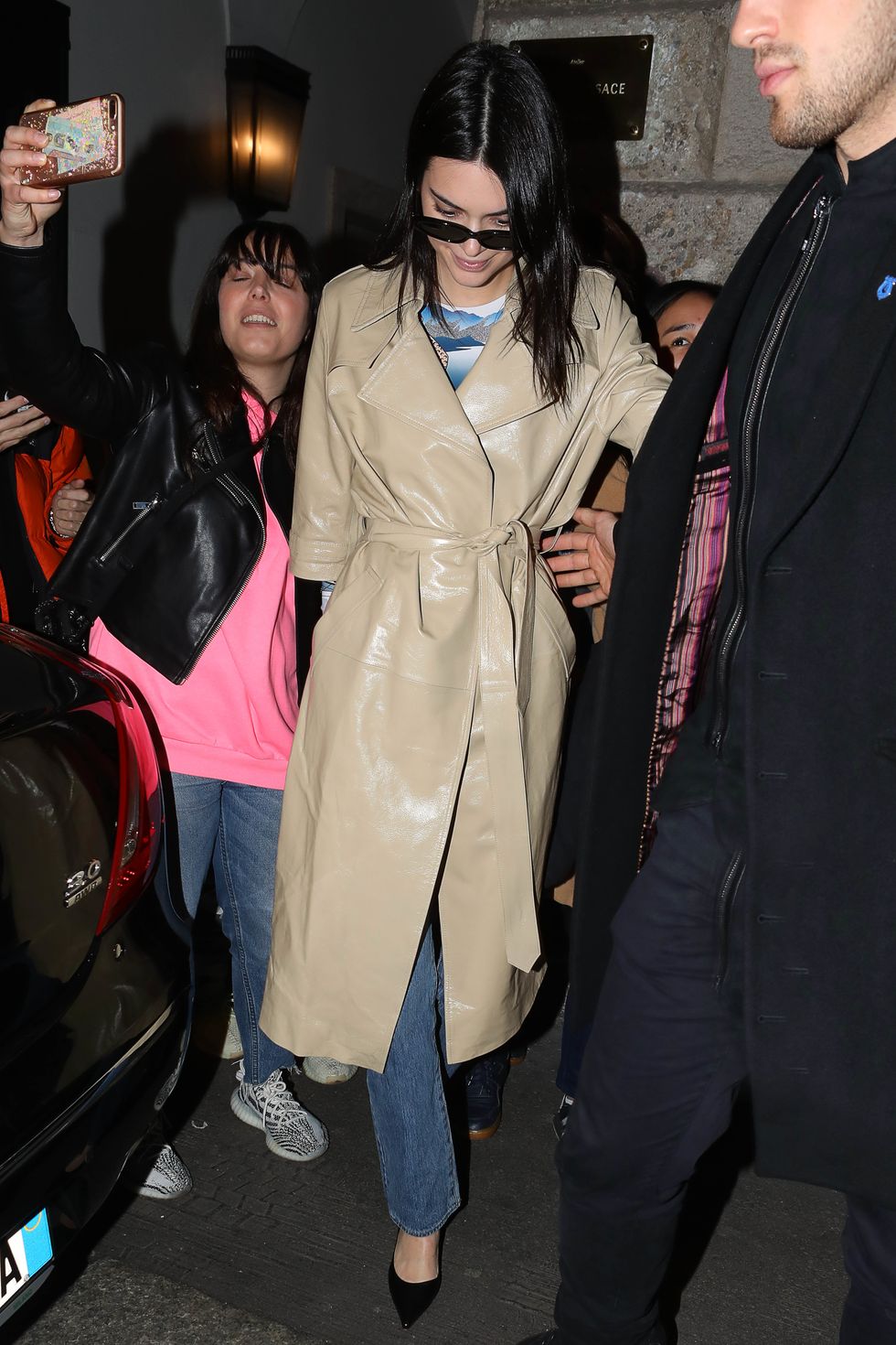 And Bella's contemporaries have been sporting them all over the globe. Kendall Jenner wore two versions in Milan: one double-breasted black leather trench (vintage?) when stepping off an airplane, and one in a nice toasted vanilla. Girlfriend of Jackson Maine Irina Shayk wore a classy fawn-colored version to the Tod's presentation. Hailey Baldwin (Bieber) was spotted in a gorgeous Balenciaga sculpted leather coat in Paris, and I have never, ever been more jealous of Hailey Baldwin.