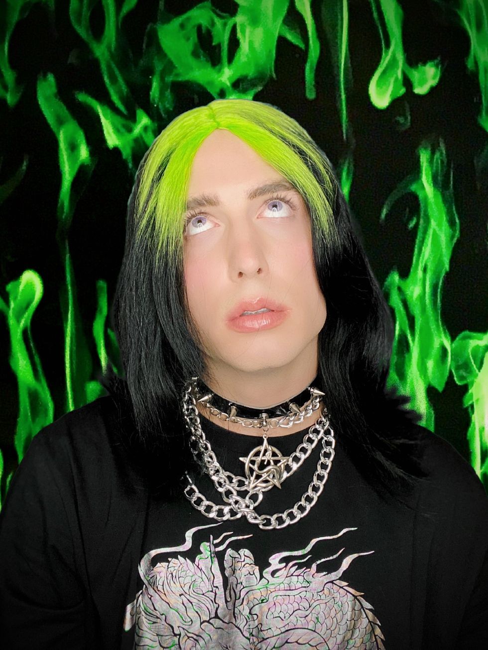 Aside from the mannerisms, Drama's look as Eilish is near perfection. From the black and blue hair with neon-green roots to the sharp lime-tinted acrylic nails and industrial raver outfit, Drama would be indistinguishable from Eilish if they were to stand together on an imaginary red carpet… albeit about a decade of age and a foot of extra height between them.