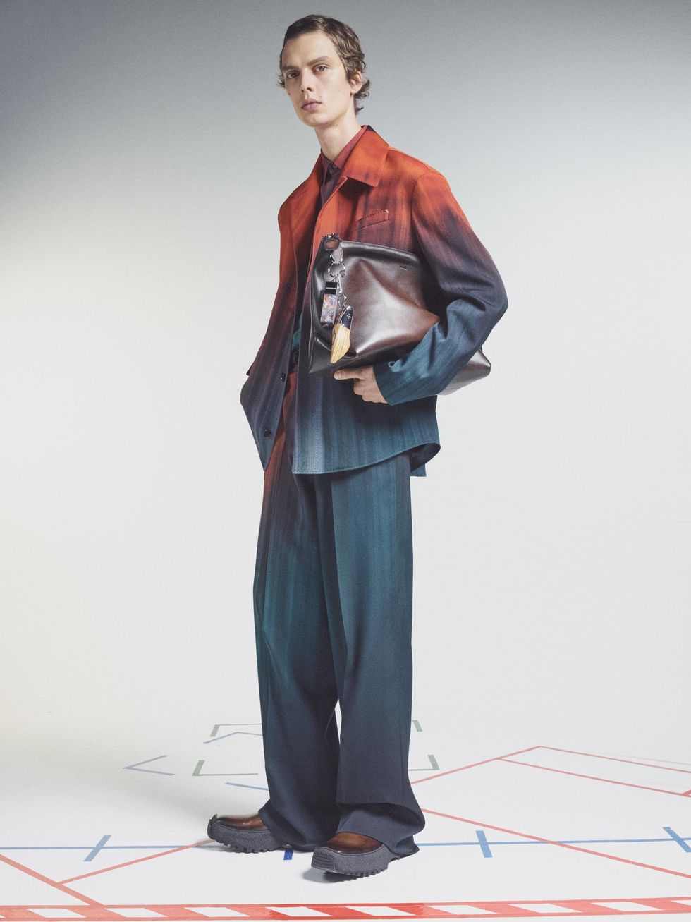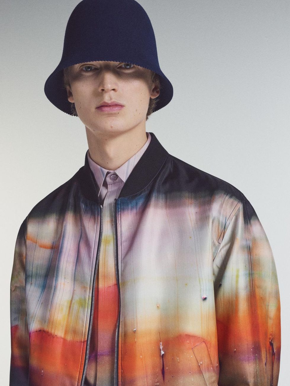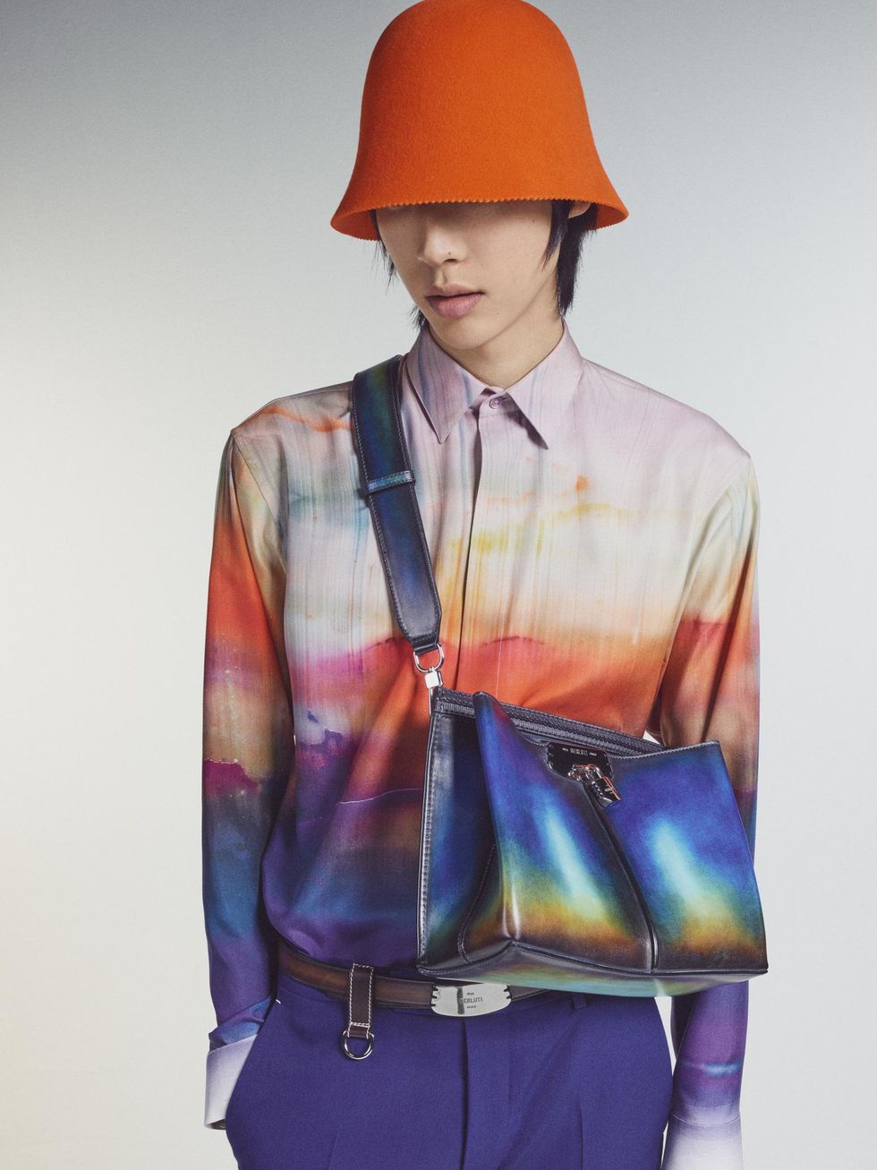 For this outing, creative director Kris Van Assche teamed up with Berlin-based Russian painter Lev Khesin, whose abstract artworks are made using techniques of multiple layers of silicone. It's the designer's second time collaborating with an artist following last season's collection with ceramicist Brian Rochefort. (Van Assche has previously said that his first few collections for Berluti were about finding the groove between his personal style in the DNA of the brand.)