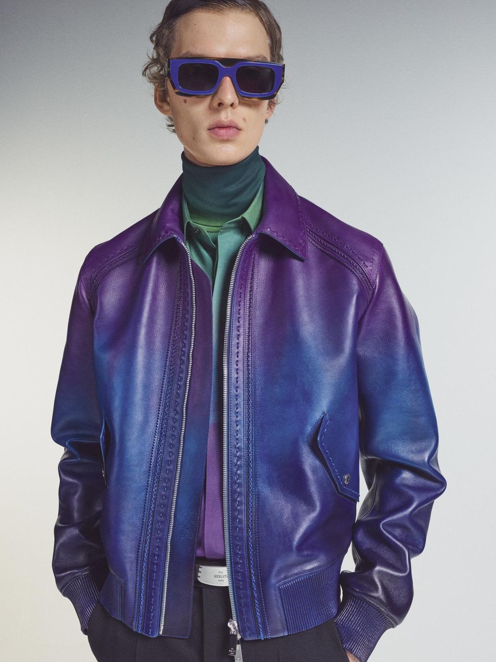 In many ways, the gradient palettes of Khesin's work resemble the signature patina techniques Berluti uses on their shoes and leather goods. The effects also found their way to suiting, knits and outerwear, where the leather jackets are dyed and faded by hand. Check out the full collection, below, in a video done in collaboration with Woodkid and director Antoine Asseraf,.