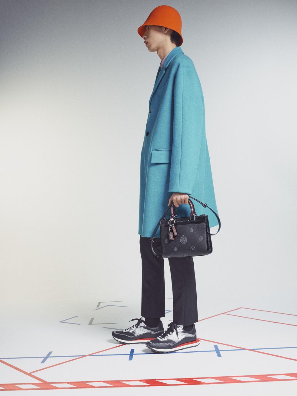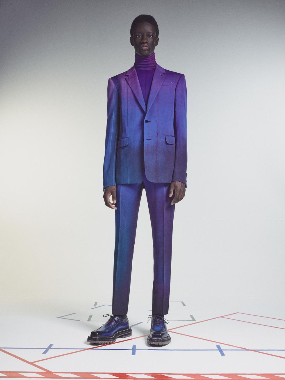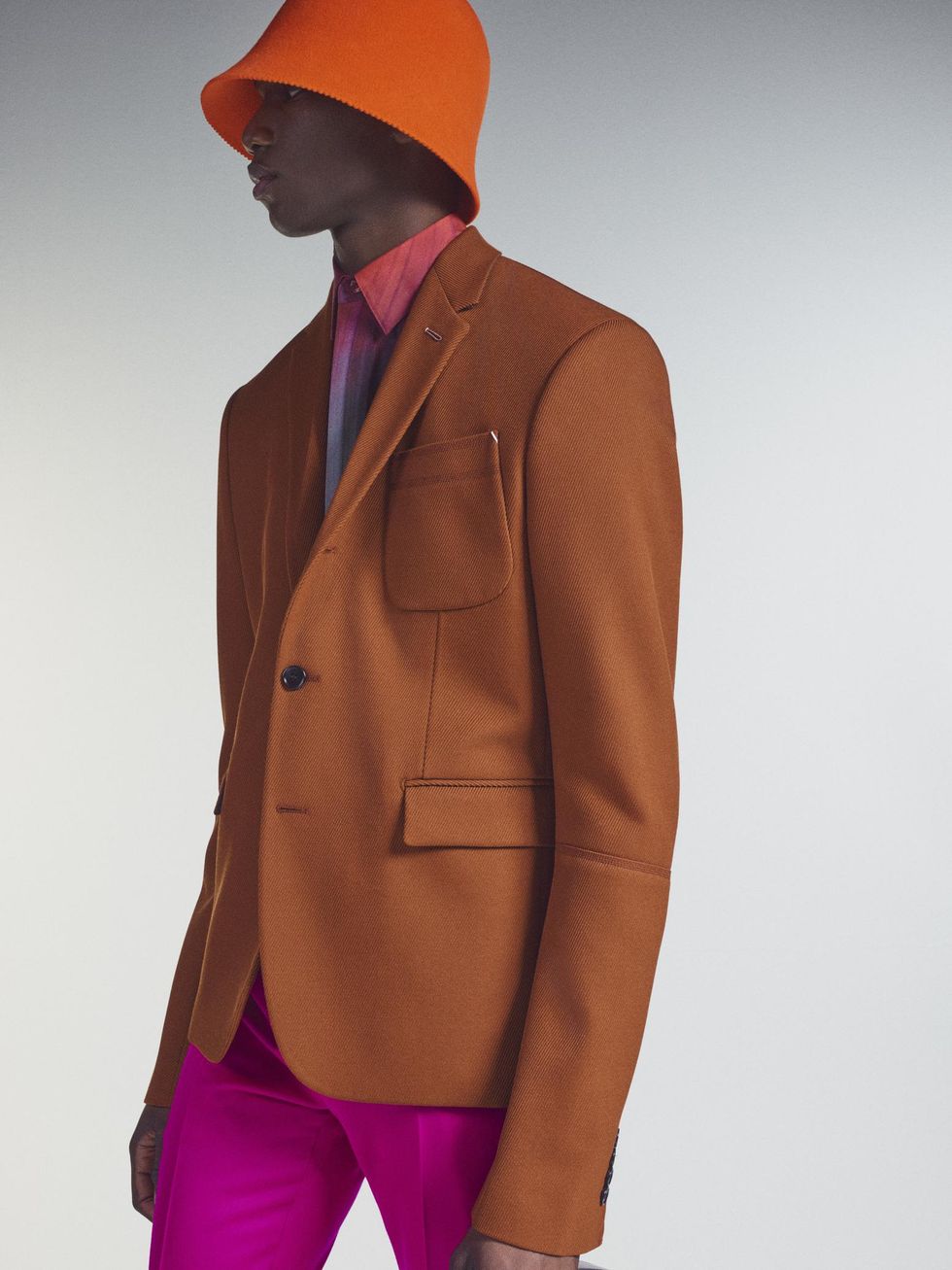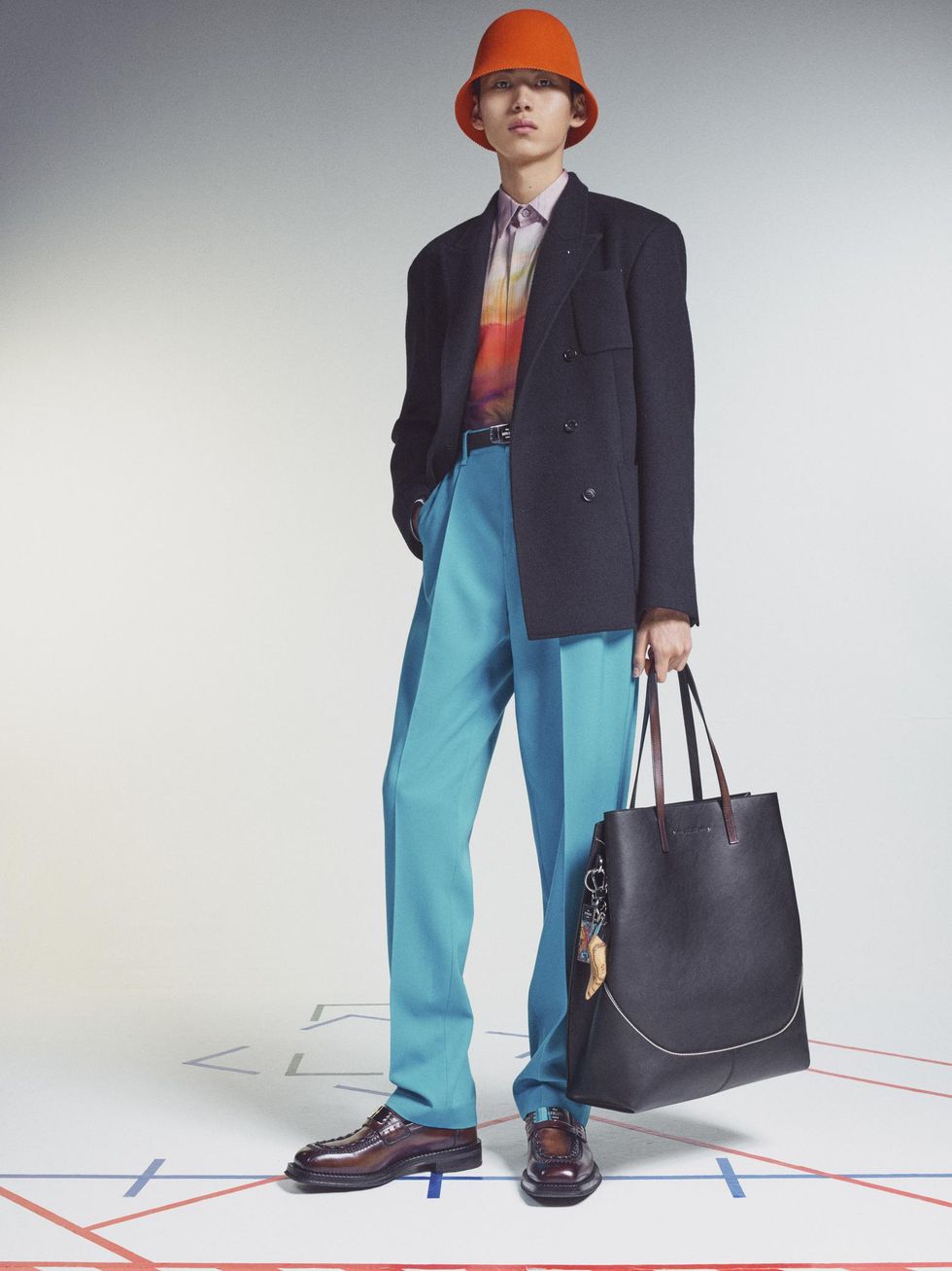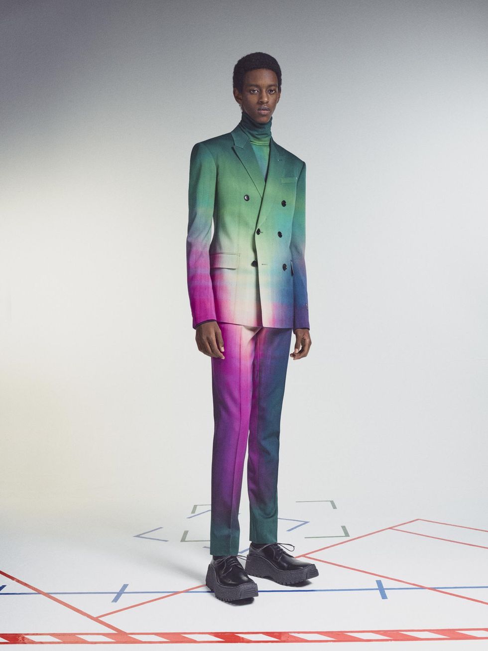 As it turns out, the ombré look was actually a sneak peek of the brand's Winter 2021 collection unveiled today. As Odom Jr's outfit hinted, the collection is packed with iridescent hues and a rainbow of colors in gradient effects. There's also mohair sweaters, bell-shaped bucket hats, plenty of color-blocking (teal, orange, fuchsia) and sporty plaid outerwear.