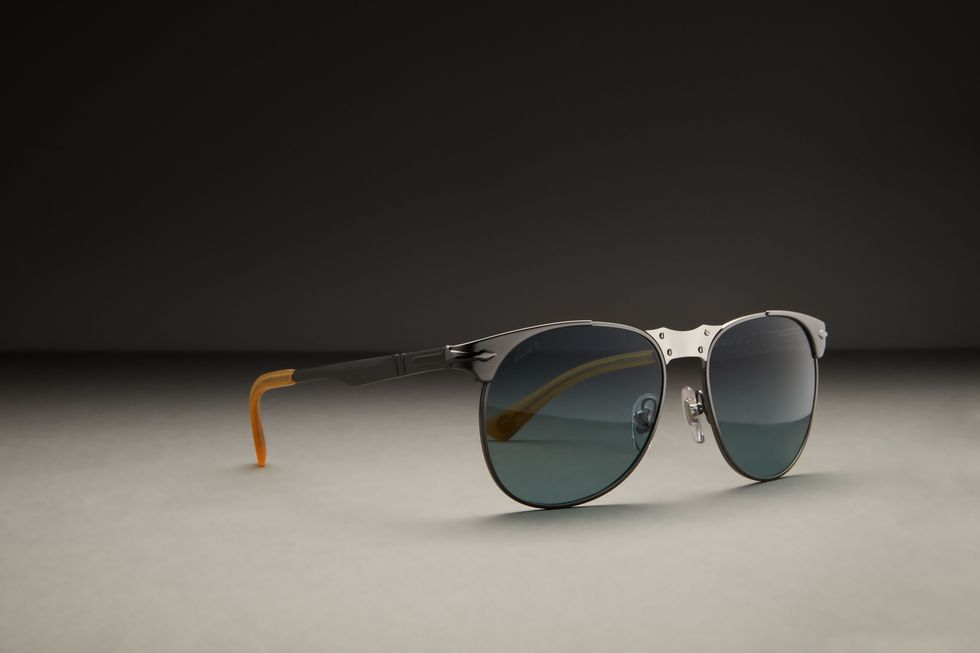 In the early design stages, Persol's visionaries discovered the actual machine used to create the frame 50 years ago in its vaults, so naturally they recommissioned the vintage contraption for the collaboration. With an authentic, timeless touch, the classic silhouette stands out with a hand-brushed metal bridge and light blue polar lenses with the respective brand logos engraved on each.