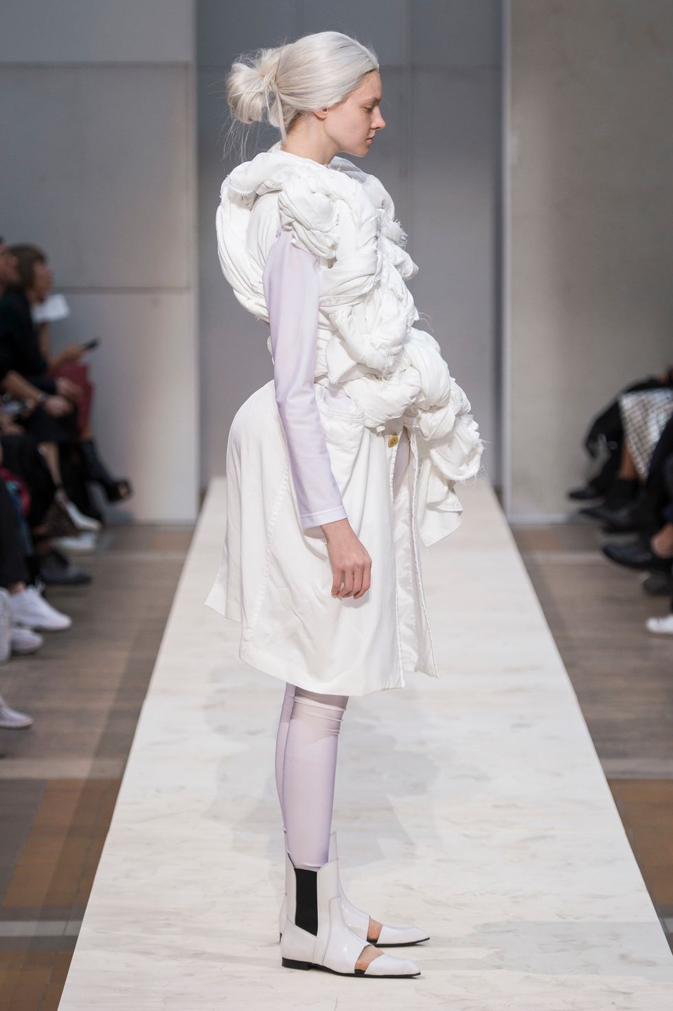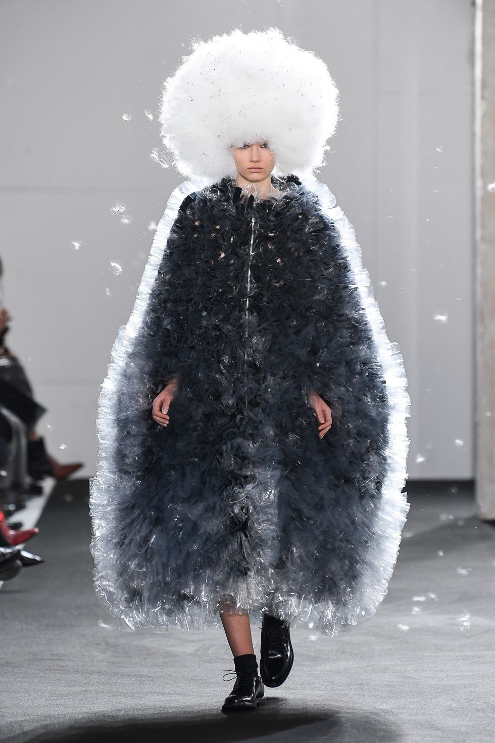 Rei Kawakubo protégé Kei Ninomiya (his label Noir Kei Ninomiya is under the Comme des Garçons umbrella) has become known for showing his collection alongside eye-catching headpieces. This season, models were topped with mohawks, afros, and tricorne-shaped wigs (designed by Azuma Makoto and Takayuki Nukui) made up of dandelions. As they glided down the runway, hundreds of seed pods floated in the air leaving a snow-like flurry in their path.