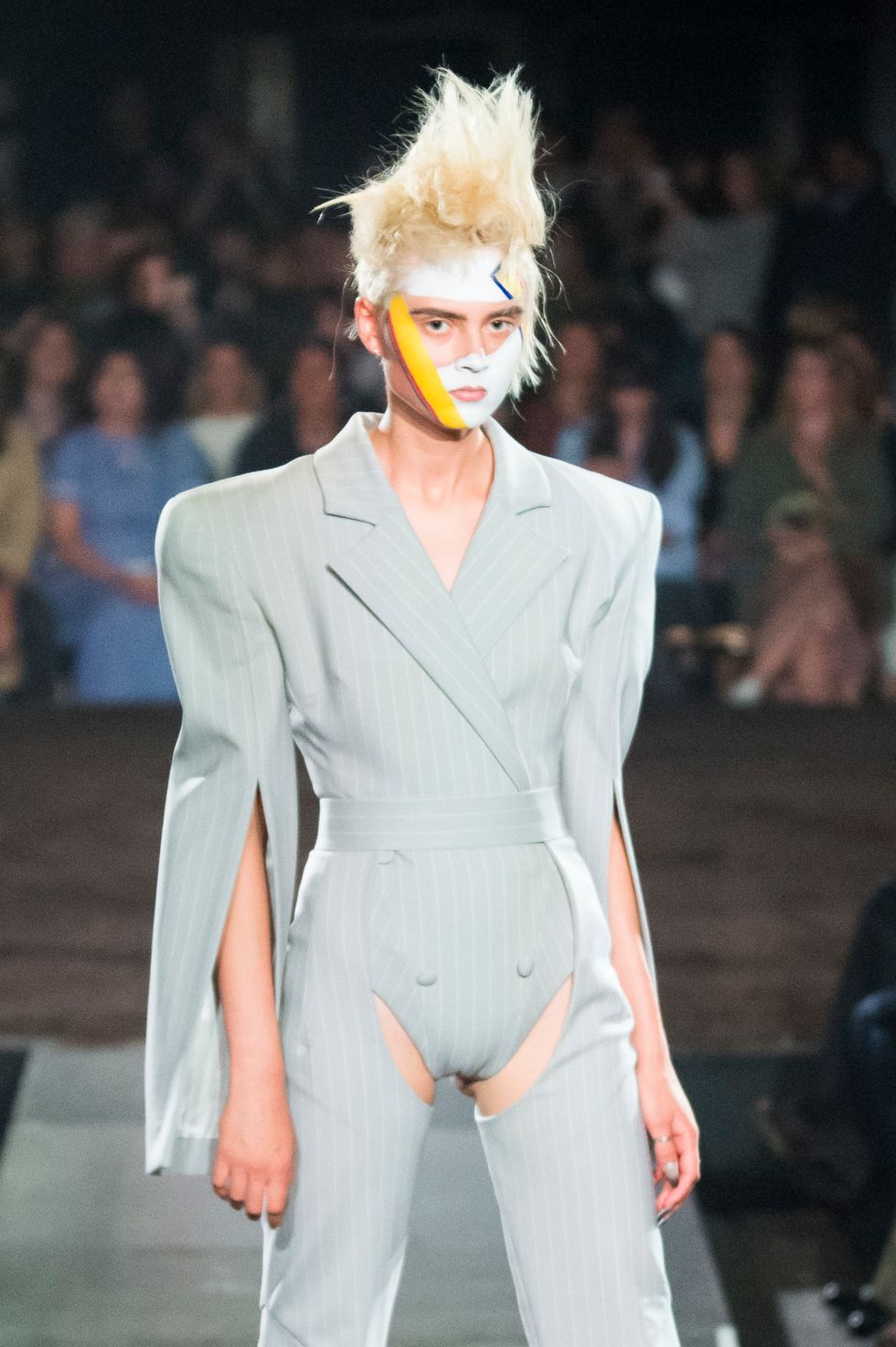 In honor of his late friend, British stylist and accessories designer Judy Blame, Gareth Pugh referenced the nightlife scene of "outside society." High-gloss finger waves and choppy rocker dos allude to club kid looks from the 1980s and 90s.