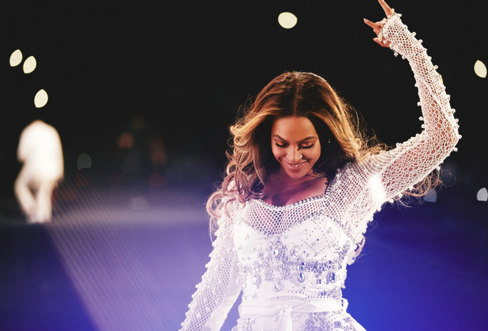 Here she is again, absolutely angelic in an all-white embroidered number (of pearls and crystals, no less), complete with silk duster coat, detachable train, and all. during a performance at Houston's NRG Stadium. Again: the glory of Tisci's new Burberry.