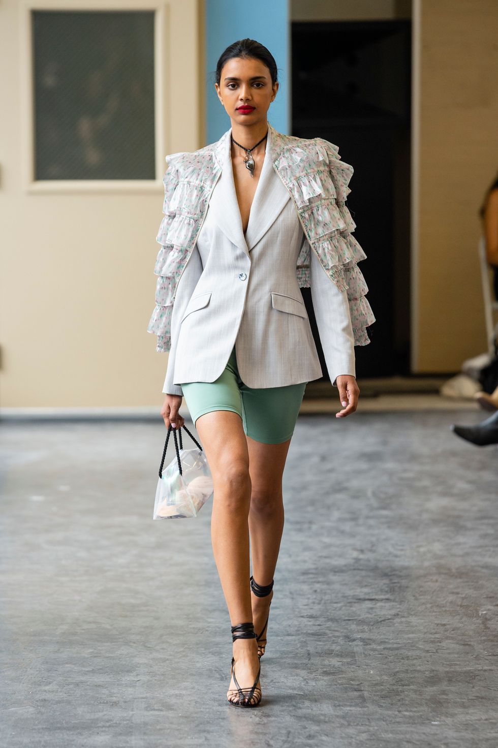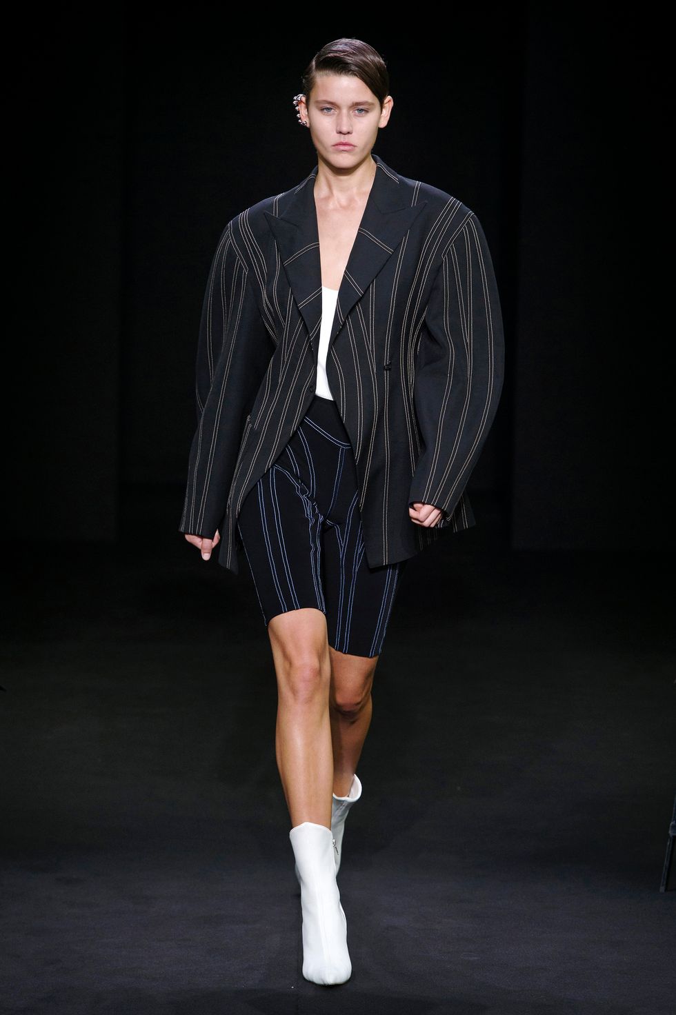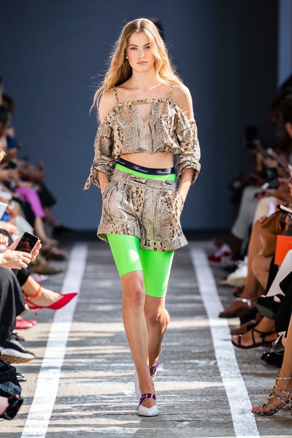 But bike shorts also popped up in collections that made few allowances for athleisure. At Maryam Nassir Zadeh, brilliant stylist Haley Wollens paired mint cycling shorts with a lace-trimmed blazer. Blumarine, normally aggressively feminine, showed a number of bike short variations: slime green, lilac lurex, snakeskin-patterned. Casey Cadwallader opened his first collection for Mugler with striped bike shorts and a matching blazer with rounded shoulders; he also showed them in swirling marble patterns made in collaboration with artist Samara Scott.