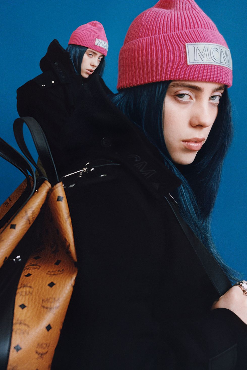 Billie stars alongside a clique of her own clones (a la Kim K's recent Caroline Lemke shoot) in luxury leather goods brand MCM's fall 2019 campaign, rocking monogram genderless asymmetrical pieces, like a petite pink fanny pack, brown leather crossbody bag, mini-backpack, beanie, and the most regal bucket hat you've ever seen.