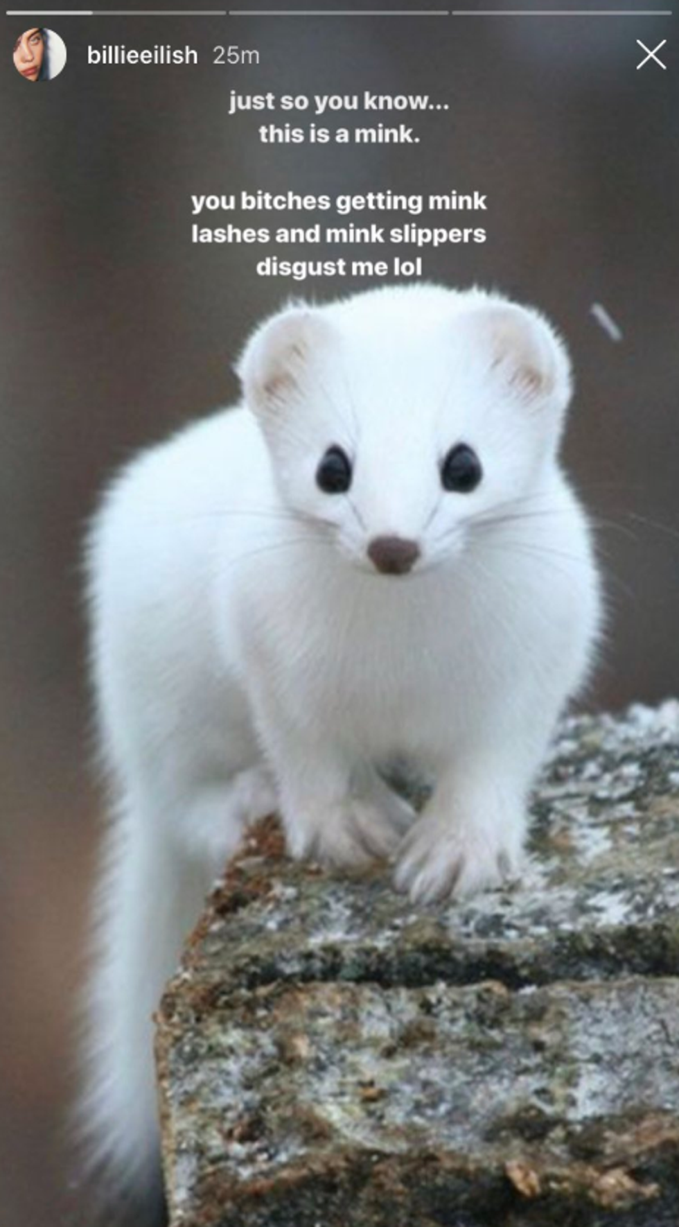 Recently, the superstar took to her Instagram Stories to take people who wear mink to task. Posting two photos of baby minks back-to-back, Eilish captioned the first pic with a little FYI directed at those buying mink accessories.