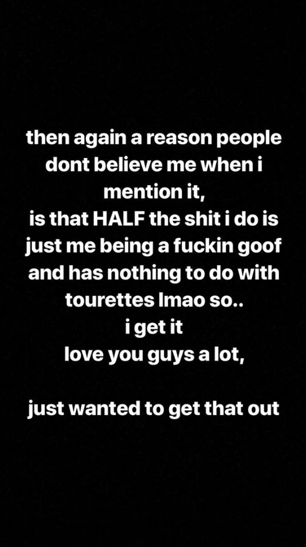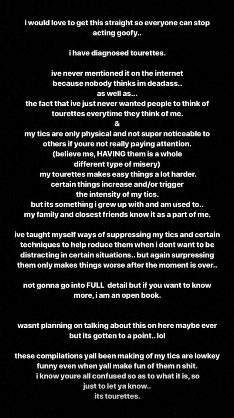 "I've never mentioned [my Tourette's] on the internet because nobody thinks I'm deadass," the singer wrote. "As well as the fact I've just never wanted people to think of Tourette's every time they think of me."